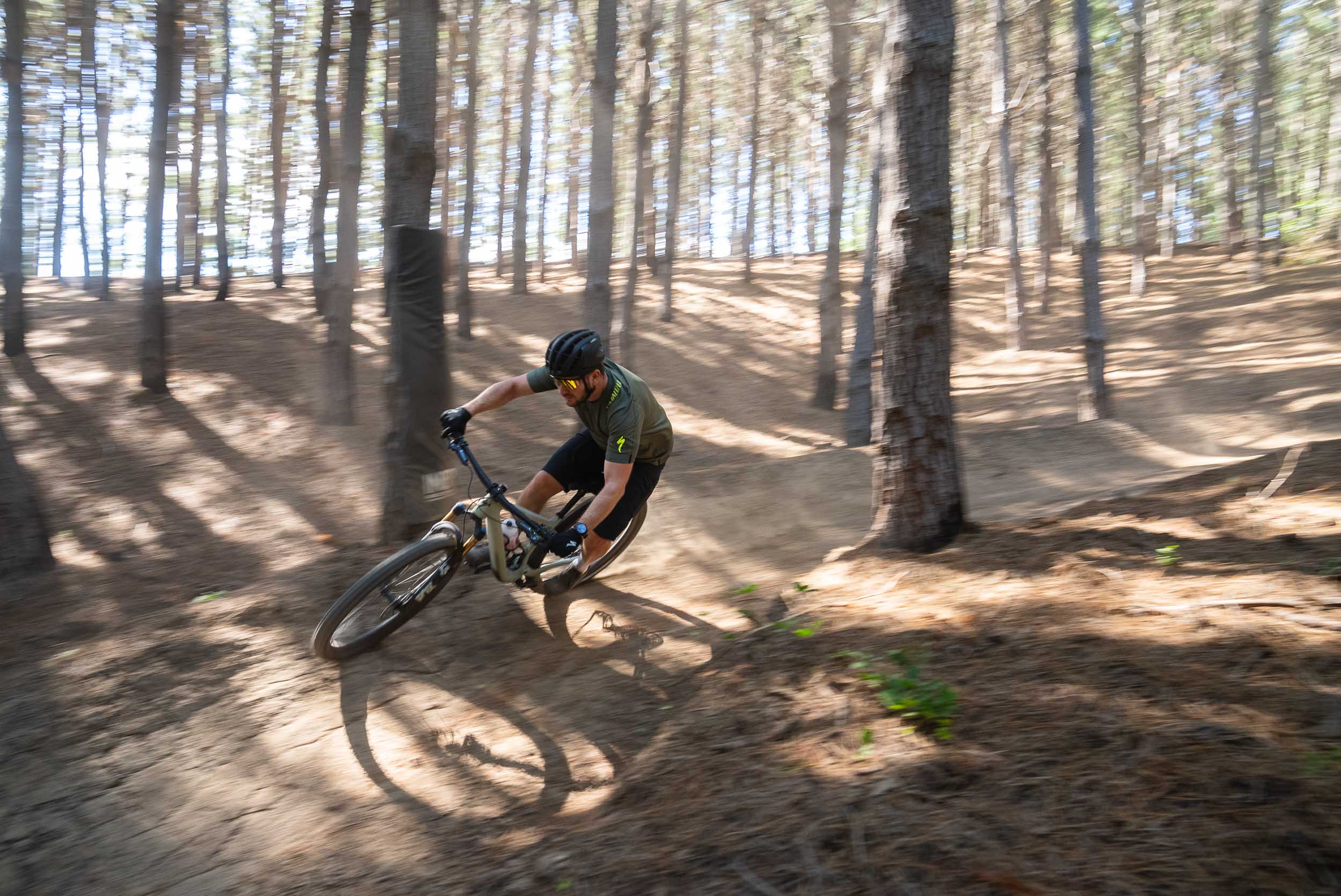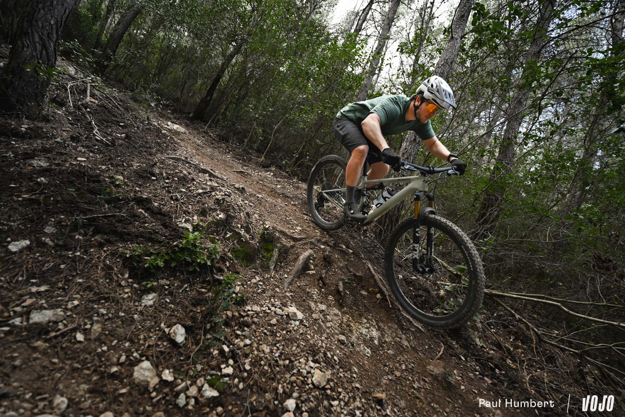 Là, quand on ne l’emmène pas sur des grosses bosses ou des virages relevés qui permettent de prendre plein de vitesse, son potentiel se révèle pleinement sur les petits singletracks techniques et sinueux, y compris quand il y a de la grosse pente et un relief tourmenté au sol. Même dans le très cassant, la gestion du débattement étonne et on a l’impression d’avoir plus que 120/130mm. Chapeau !