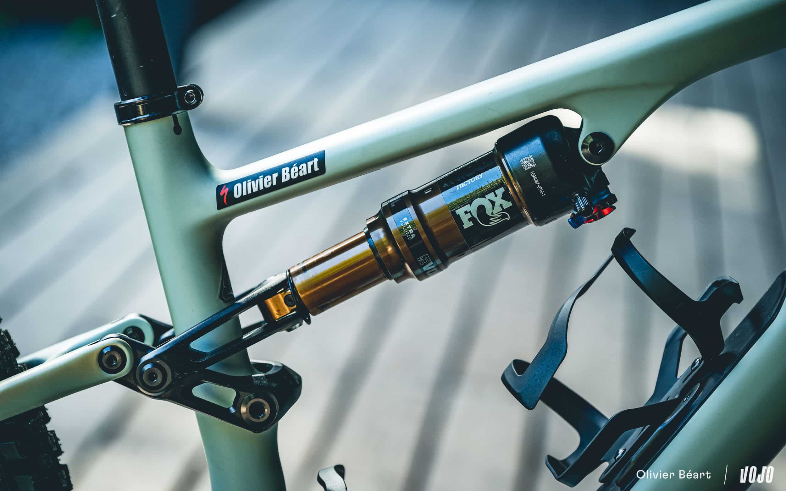 On peut jouer sur la mollette noire de réglage de la compression 3 positions de l’amortisseur Fox en la passant de 1 à 2 (la 3 est trop dure selon nous et influence les réactions du vélo ailleurs qu’en côte) mais cela ne vaut pas un vrai mode intermédiaire, qu’on aurait aimé retrouver ici comme sur l’Epic 8 en version XC, quitte à ce que le système soit recalibré sur l’Evo.