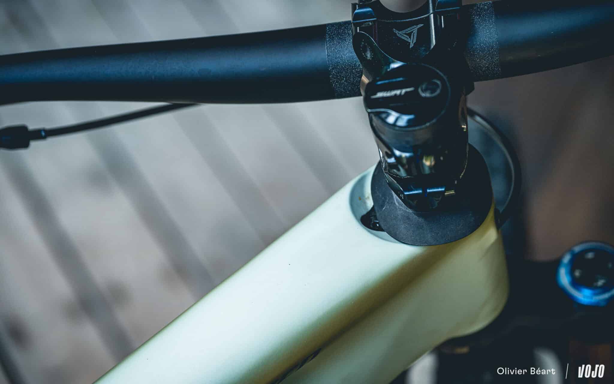 Au niveau de la douille de direction, on retrouve aussi un nouveau système de butée qui permet d’éviter tout contact entre le poste de pilotage et le tube supérieur. Le jeu de direction dispose de perçages permettant de faire passer Durit et câbles si on le souhaite, mais le cadre dispose de perçages et est monté d’origine avec un passage plus classique