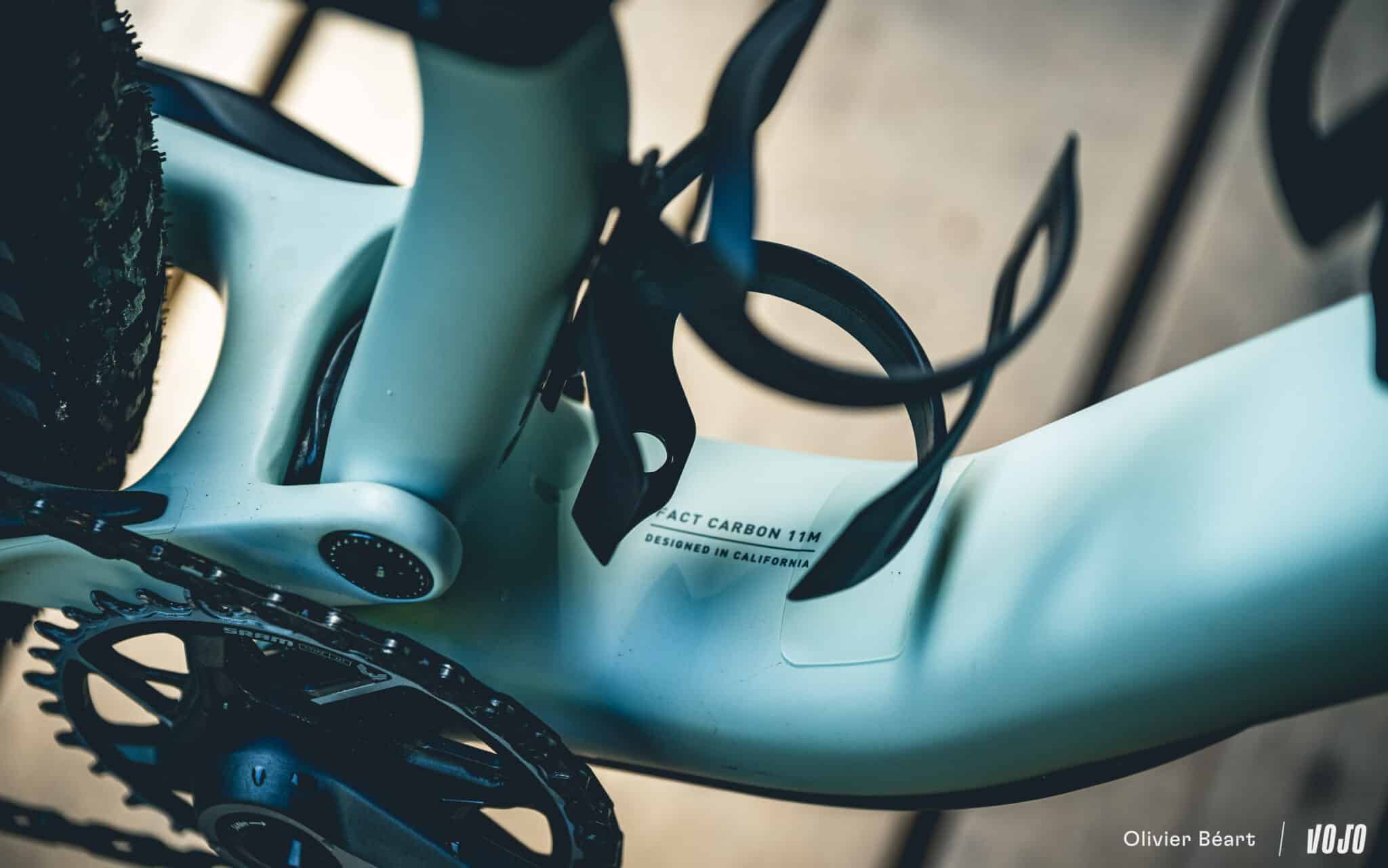 Le cadre du Specialized Epic 8 Evo bénéficie des mêmes nouveautés structurelles que son jumeau l’Epic 8 avec notamment le tube diagonal bodybuildé qui intègre la Swat Door 4.0 permettant d’utiliser le volume intérieur comme espace de stockage. Cette augmentation du diamètre du tube diagonal profite à la rigidité de la partie basse du cadre, mais Specialized insiste sur le fait que le cadre de l’Epic 8 n’est pas « bêtement » plus rigide. Pour être plus juste, on dira que Specialized a savamment revu le dosage de la rigidité, en travaillant aussi sur l’absorption des vibrations dans le but de réduire la fatigue du pilote.