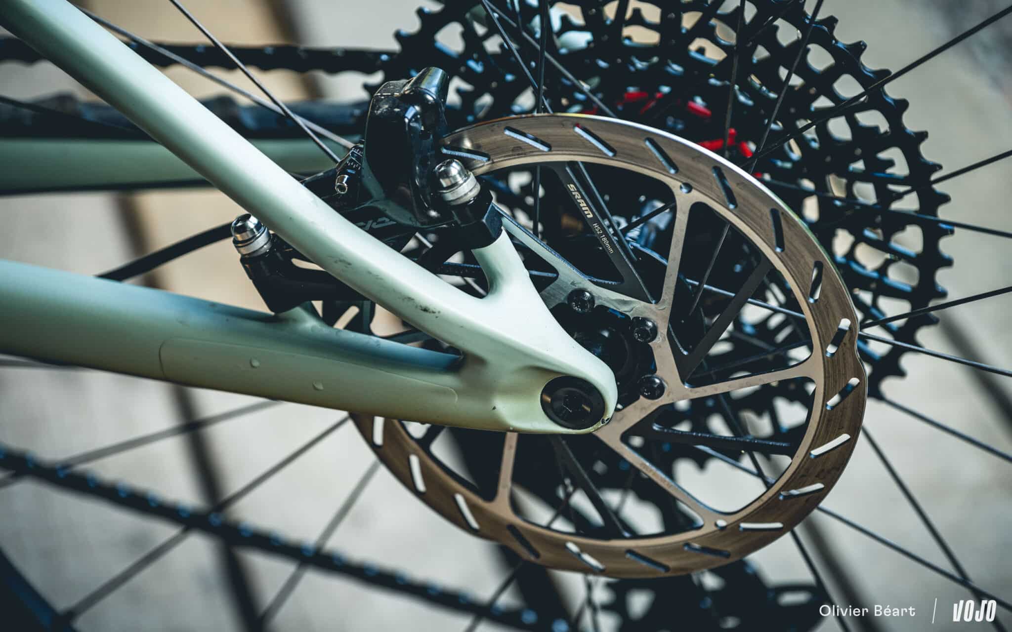 Du côté des équipements, on constate la présence de pneus avec un profil, une carcasse et une gomme plus engagés : Specialized Ground Control en 2.35, gomme T7 (intermédiaire) et carcasse Grid renforcée à l’arrière, combiné avec un Purgatory 2.4, gomme tendre T9 et carcasse Grid à l’avant. Les roues restent par contre les mêmes que sur l’Epic 8 de XC.