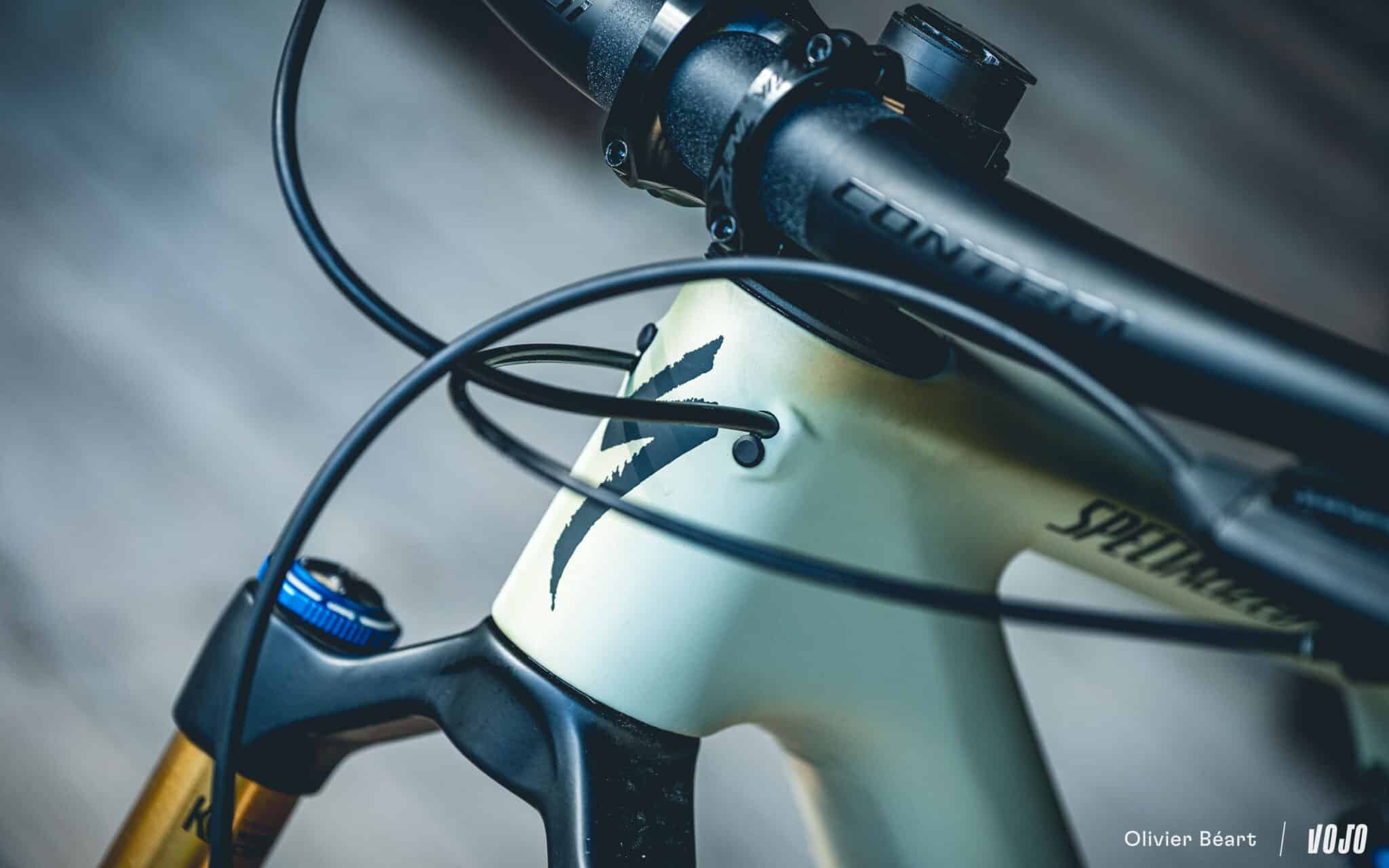 Quand on passe directement, comme nous l’avons fait, du Specialized Epic 8 S-Works avec ses suspensions électroniques RockShox Flight Attendant XC à l’Epic 8 Evo Pro, le contraste est assez saisissant ! Visuellement, on voit immédiatement qu’on est sur un plus « gros vélo », notamment à cause des pneus, et la position est assez différente avec un poste de pilotage quasi 4 cm plus haut que sur l’Epic 8. Logique, la fourche Fox est plus haute que la SID et a 1 cm de débattement en plus, et le poste de pilotage de l’Epic 8 Evo adopte une potence droite et un cintre légèrement relevé quand son faux jumeau l’Epic 8 adopte un combo avec une potence à angle négatif et un cintre plat.