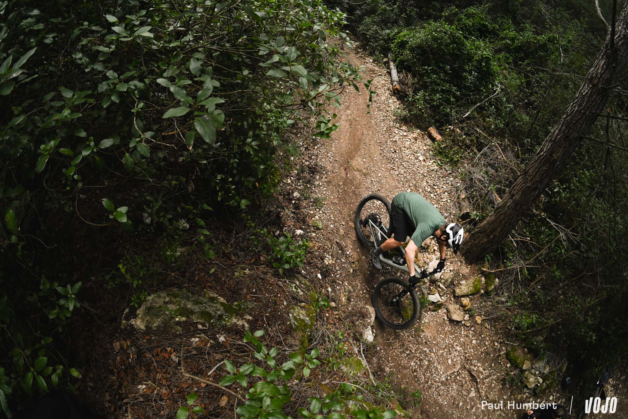 Ensuite, nous l’avons emmené une semaine dans le sud de la France, entre Marseille et Aix, sur le Régagnas et alentour. Et là, ça a été une véritable révélation. Sur des montées plus longues effectuées sur de beaux DFCI, le vélo pédale très bien en position bloquée et permet de monter bien plus vite qu’avec un vrai all-mountain et, bien sûr, qu’avec un gros enduro. Cela va vous paraître un peu bizarre de dire cela, mais il en devient presque une alternative à un e-bike pour quelqu’un qui est dans une forme correcte, tant il permet de faire passer vite les ascensions. Puis, dans les descentes du Sud, wow, quel plaisir !