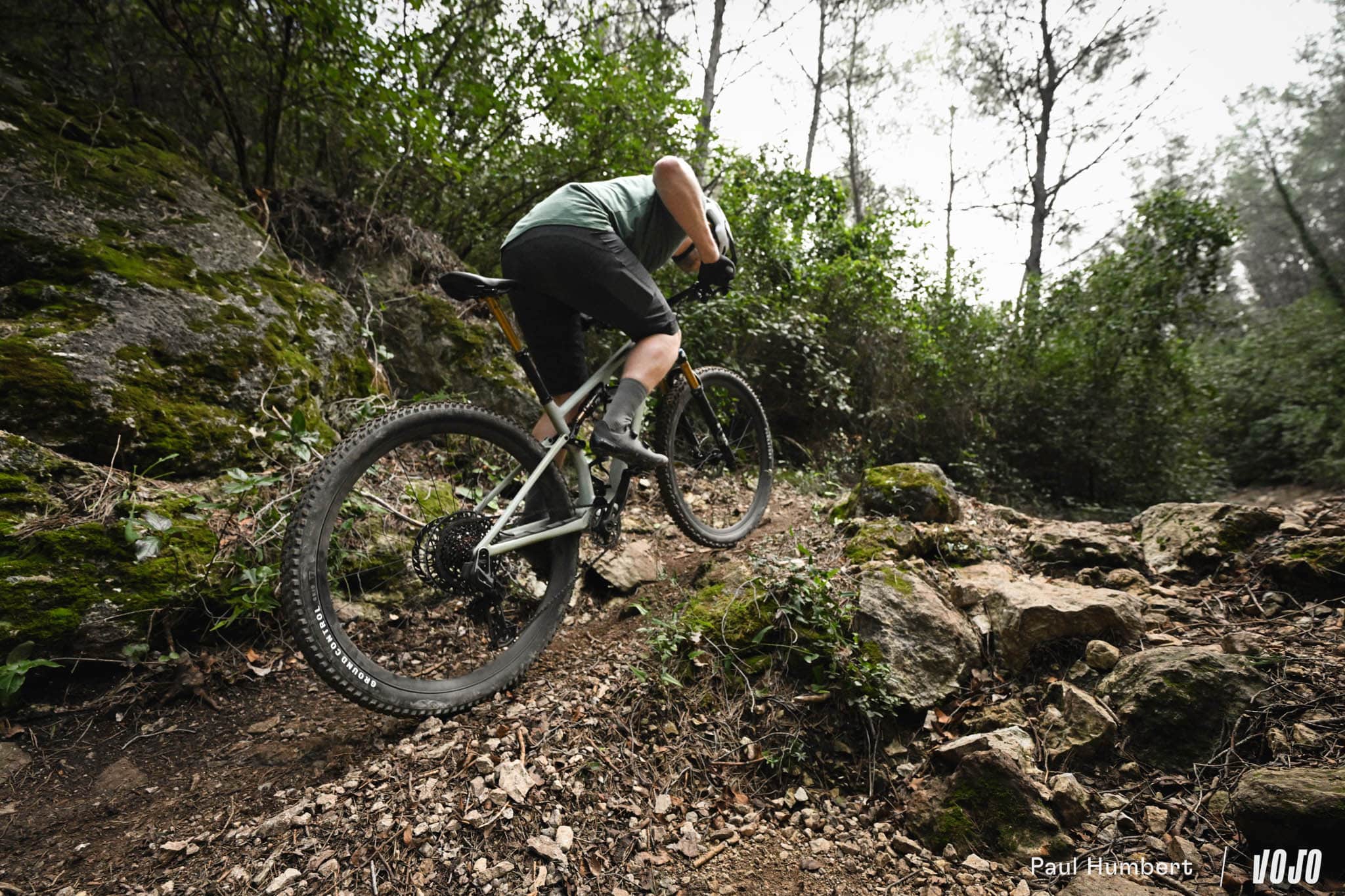 Alors que le cadre a un côté très exigeant quand on le pousse à la limite sur des grosses bosses et des virages relevés de bike-park, il montre un tout autre visage dans la caillasse. Là, les suspensions ne semblent jamais dépassées et le cadre fait preuve d’un compromis très juste entre tolérance et réactivité pour offrir un comportement très fun mais jamais traître.
