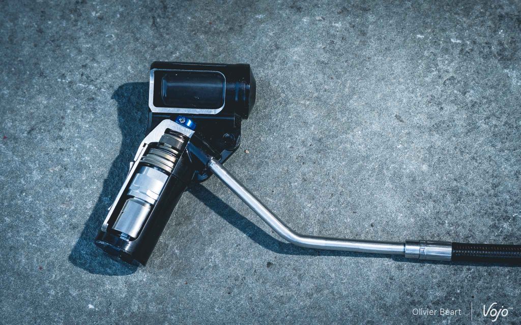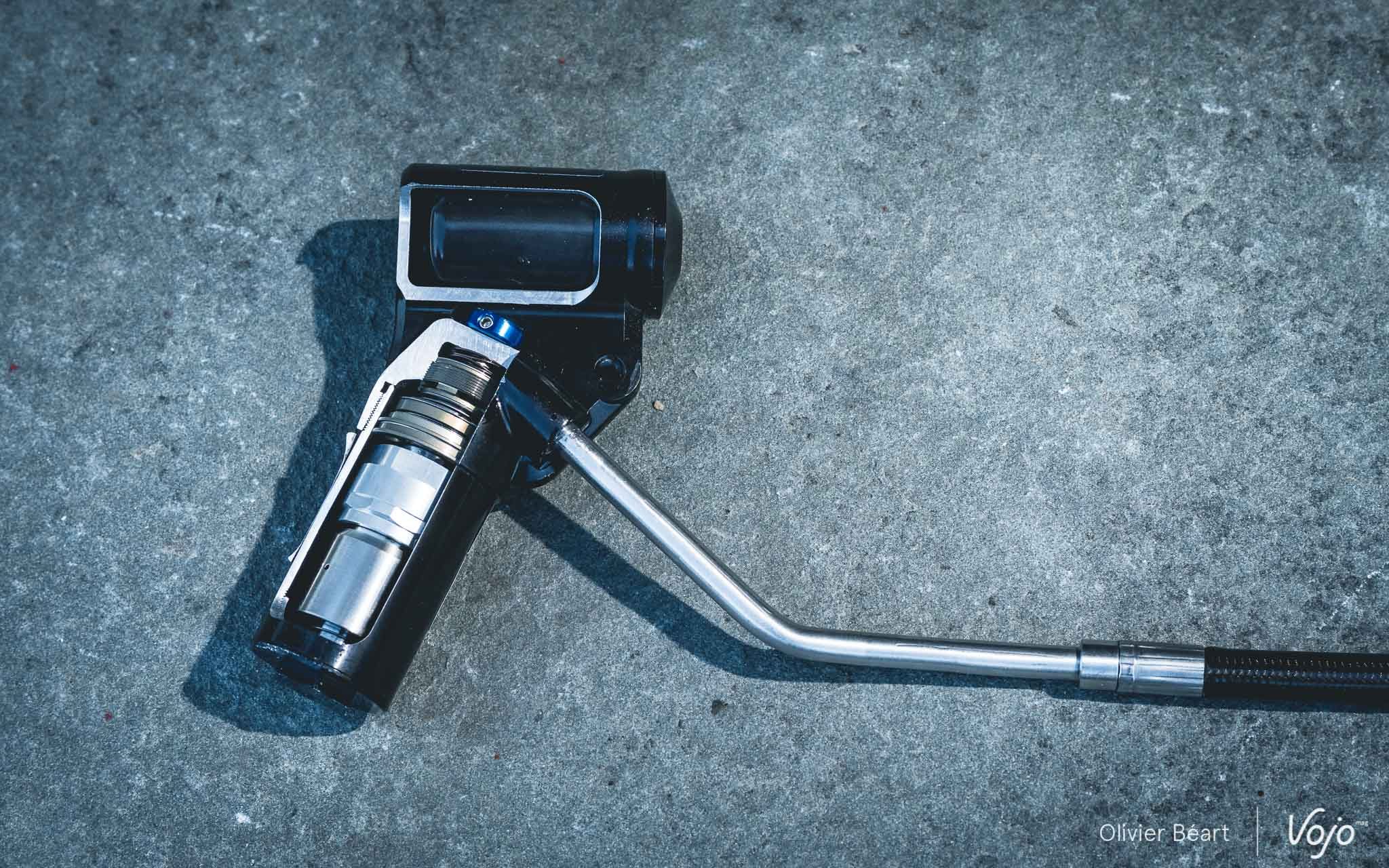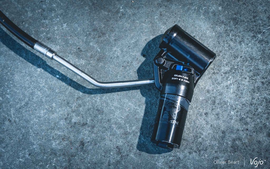 Désormais situé derrière l’axe de roue pour augmenter le bras de levier et donc la sensibilité au déclenchement de la petite masselotte, le Brain est réglable sur 5 positions, de plus souple (ouvert) à plus ferme. La Durit qui connecte l’amortisseur et le Brain a aussi été revue et se connecte désormais à même la biellette, dans laquelle le fluide circule, pour avoir le trajet le plus court possible et éviter les turbulences. Ce qui influence aussi la sensibilité. Enfin, on trouve toujours le très pratique système Autosag, permettant de régler très facilement l’amortisseur à la bonne pression.