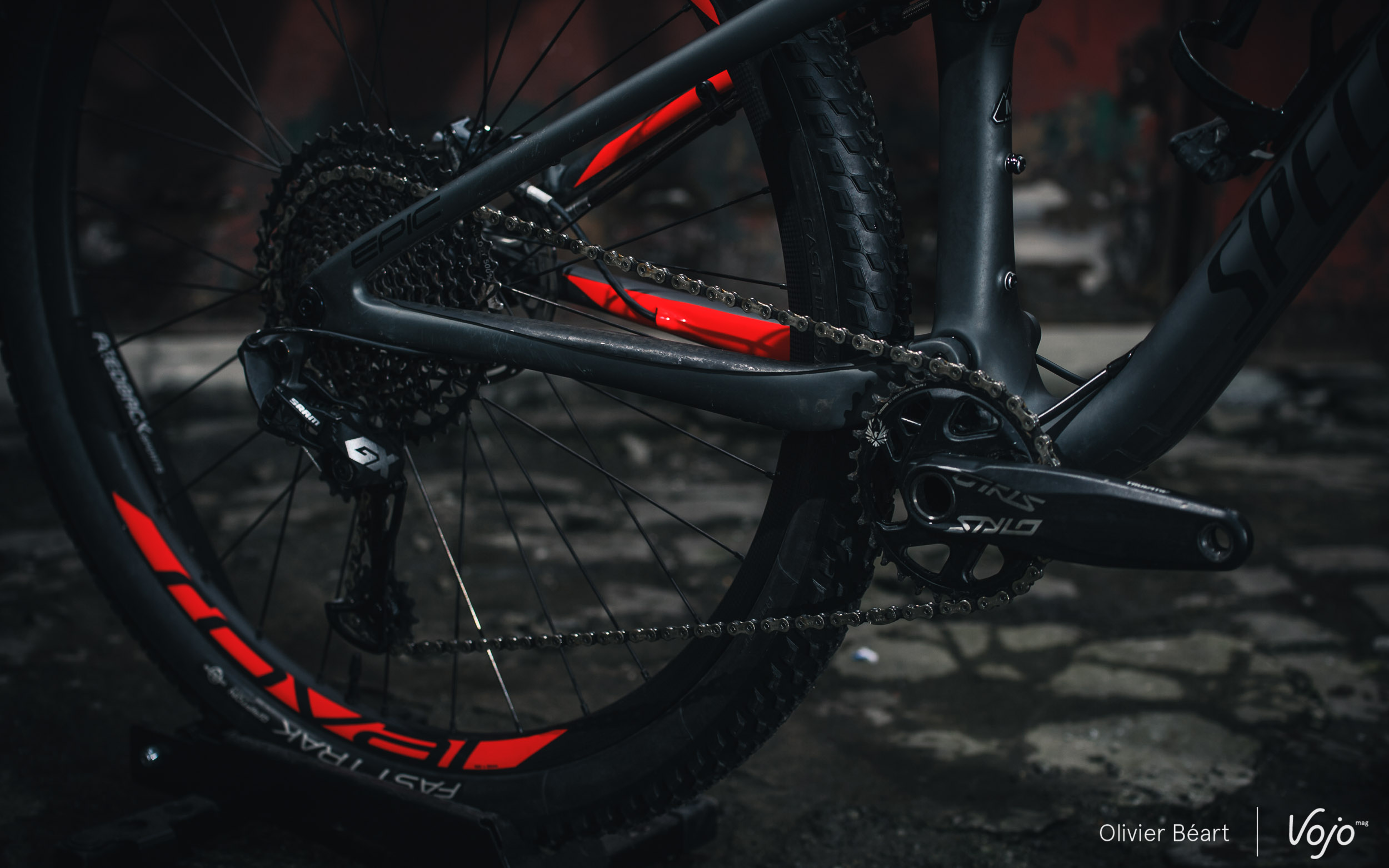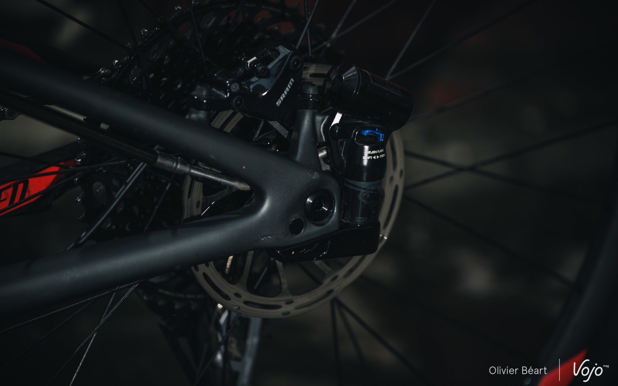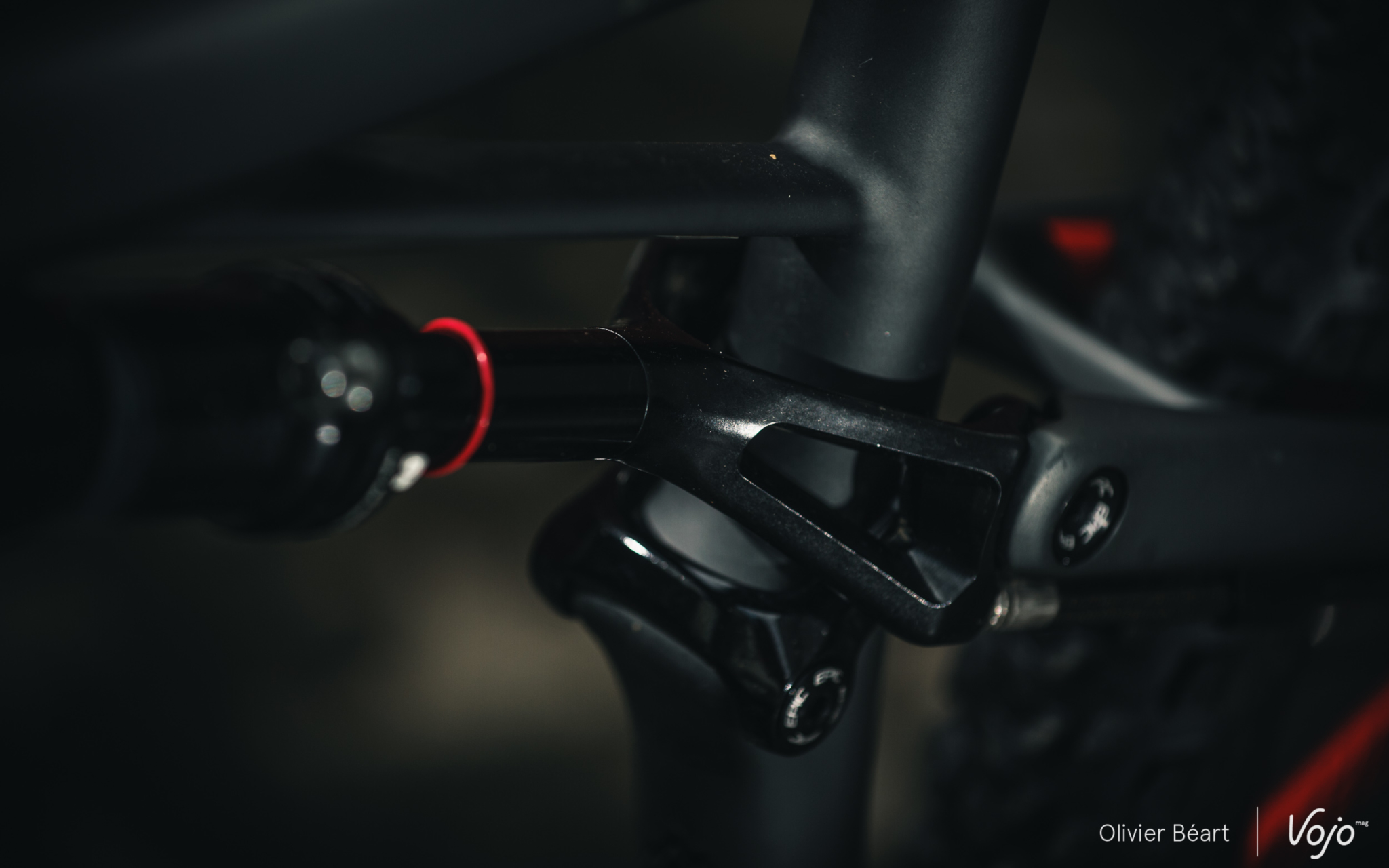 Les raisons sont simples : gain de poids (de l’ordre de 240g), mais aussi en fiabilité et en simplicité d’entretien avec la suppression d’un point de pivot. Techniquement, la nouvelle suspension de l’Epic est donc de type mono-pivot avec biellette, et la (légère) déformation du triangle arrière se fait désormais par la flexibilité du carbone au niveau des haubans et plus via un roulement sur les bases.