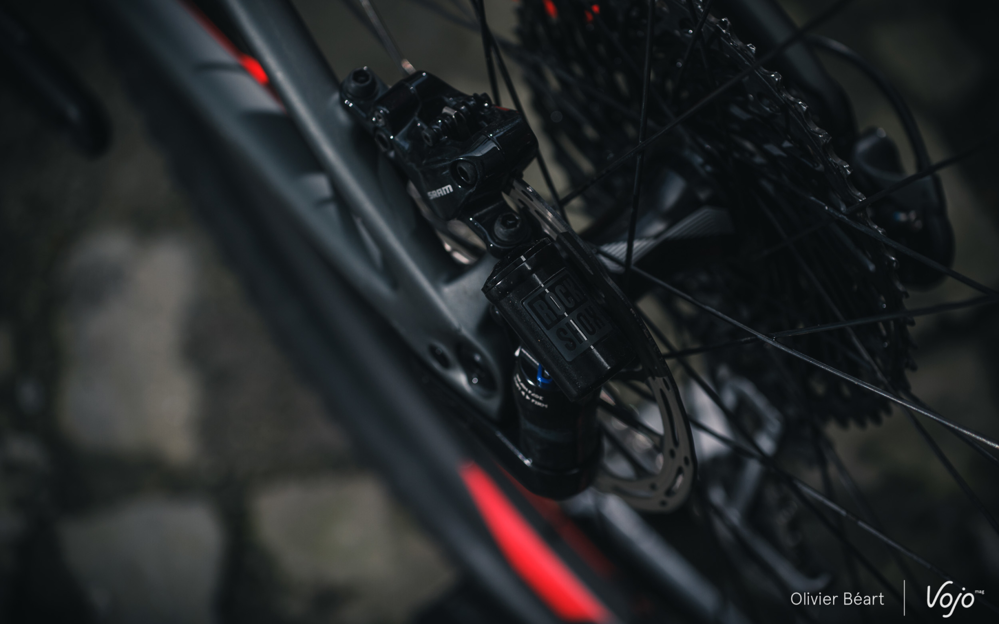 Outre le cadre, dont on a déjà dit qu’il a maintenant aussi un bras arrière en carbone, les roues ont également droit à un passage à la fibre, avec des jantes Roval Control en 22mm de large, montées sur des moyeux Specialized maison. Ce ne sont pas les cercles les plus légers ni les plus modernes de la gamme Roval, puisqu’il s’agit d’anciennes jantes qui reprennent du service en étant montées avec des moyeux maison plutôt entrée de gamme, mais l’avantage en rapport poids/rigidité/solidité par rapport à des cercles alu équivalents est intéressant, même si cette paire de roues, qu’on ne retrouve pas dans la gamme Roval after-market, est au final assez lourde.