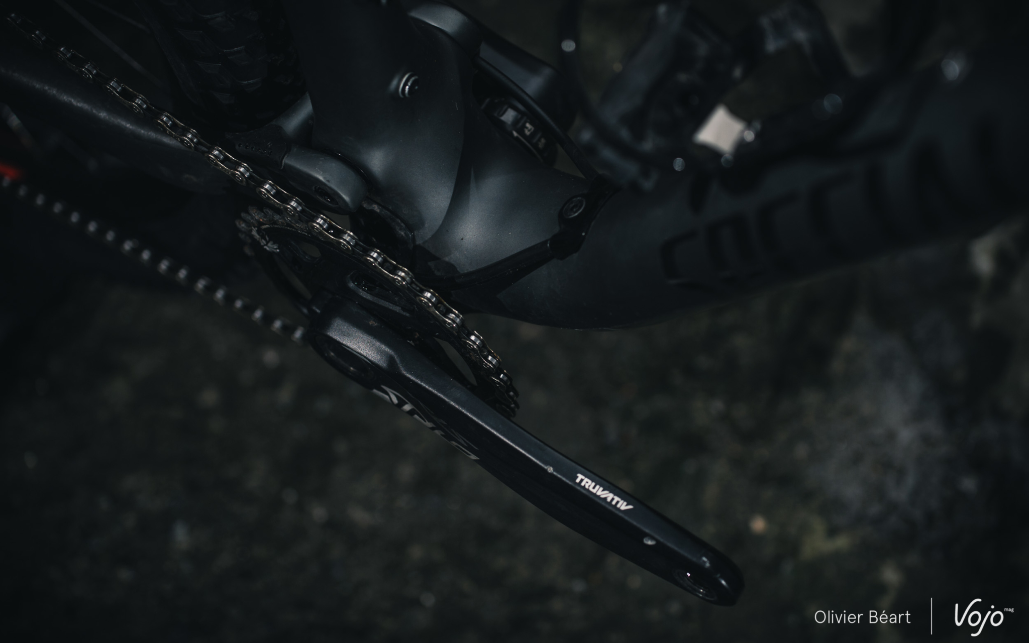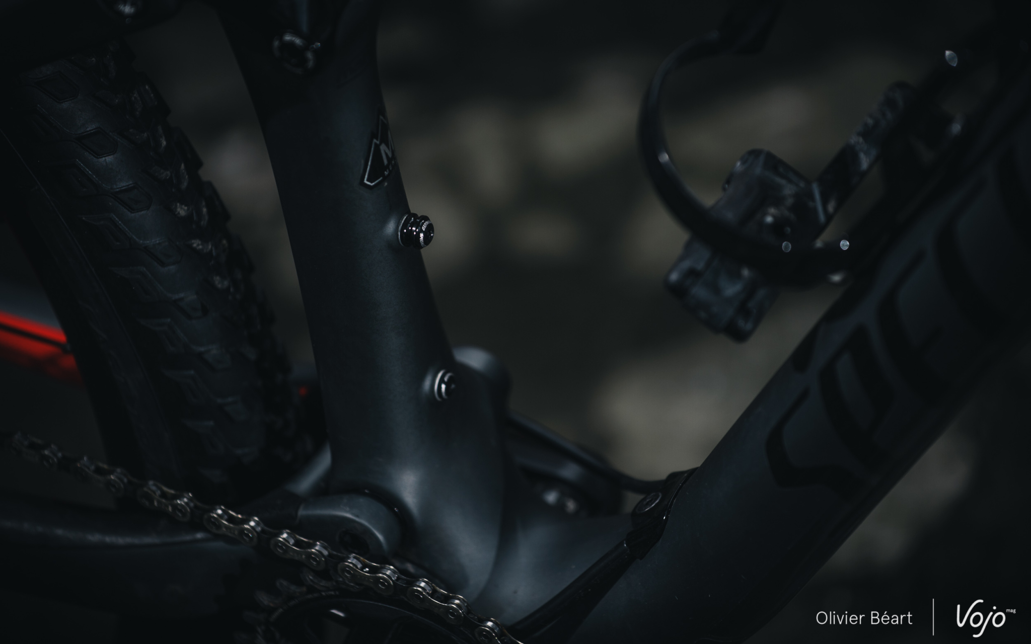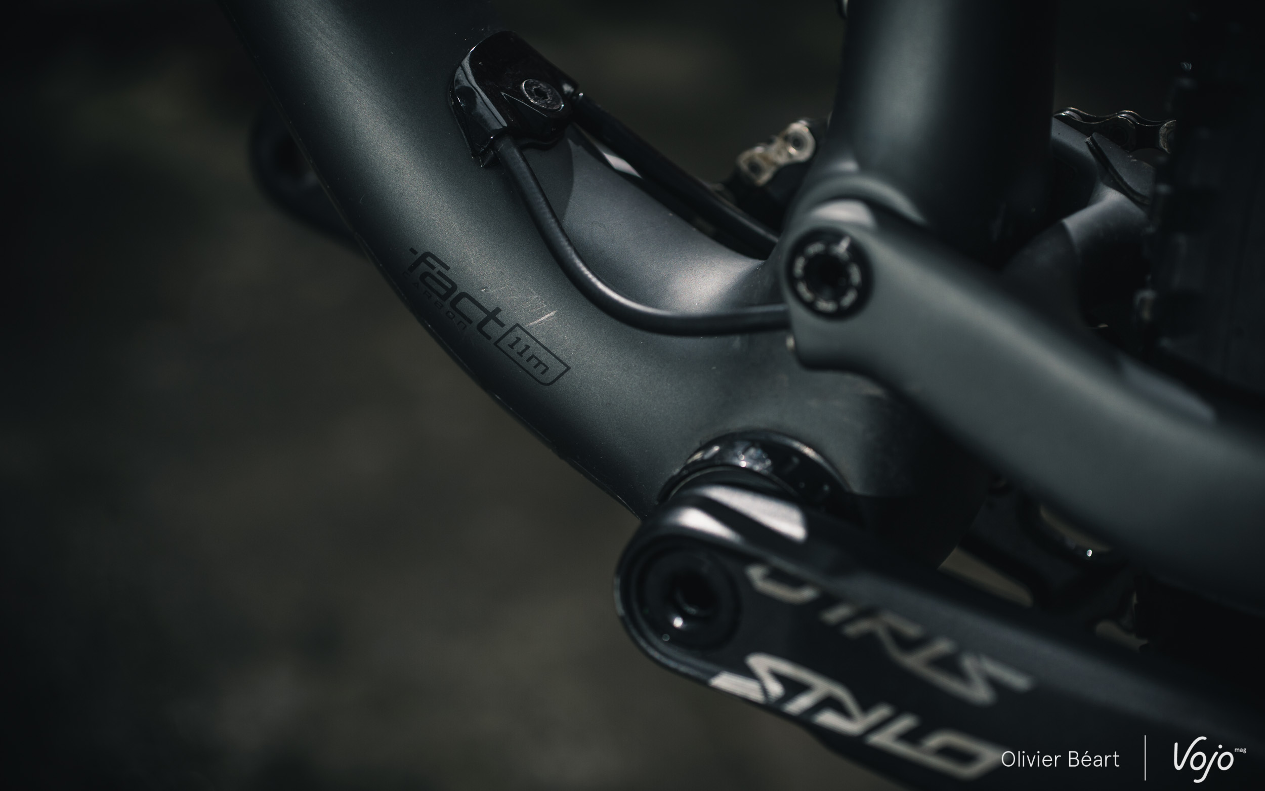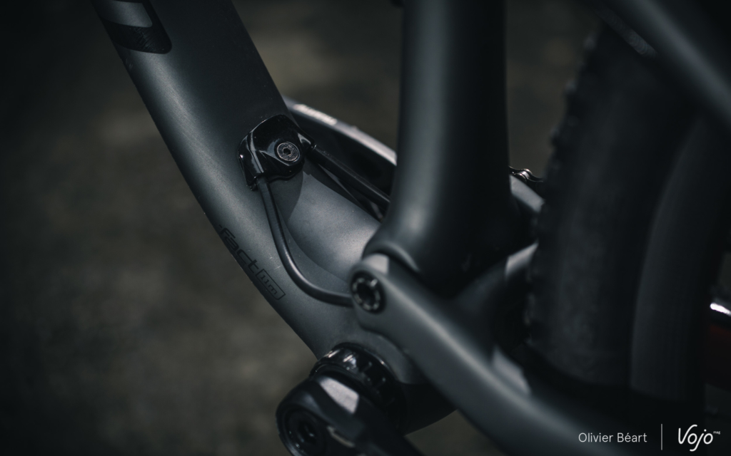 Parmi les détails qui ont attiré notre attention, on notera le passage semi-interne des câbles, particulièrement bien pensé et qui facilite les opérations de montage/démontage ; la présence d’un boîtier de pédalier fileté, dont la fiabilité et le côté pratique ne sont plus à prouver ; et enfin la possibilité de monter deux porte-bidons, ce qui n’est pas très courant sur les fulls.