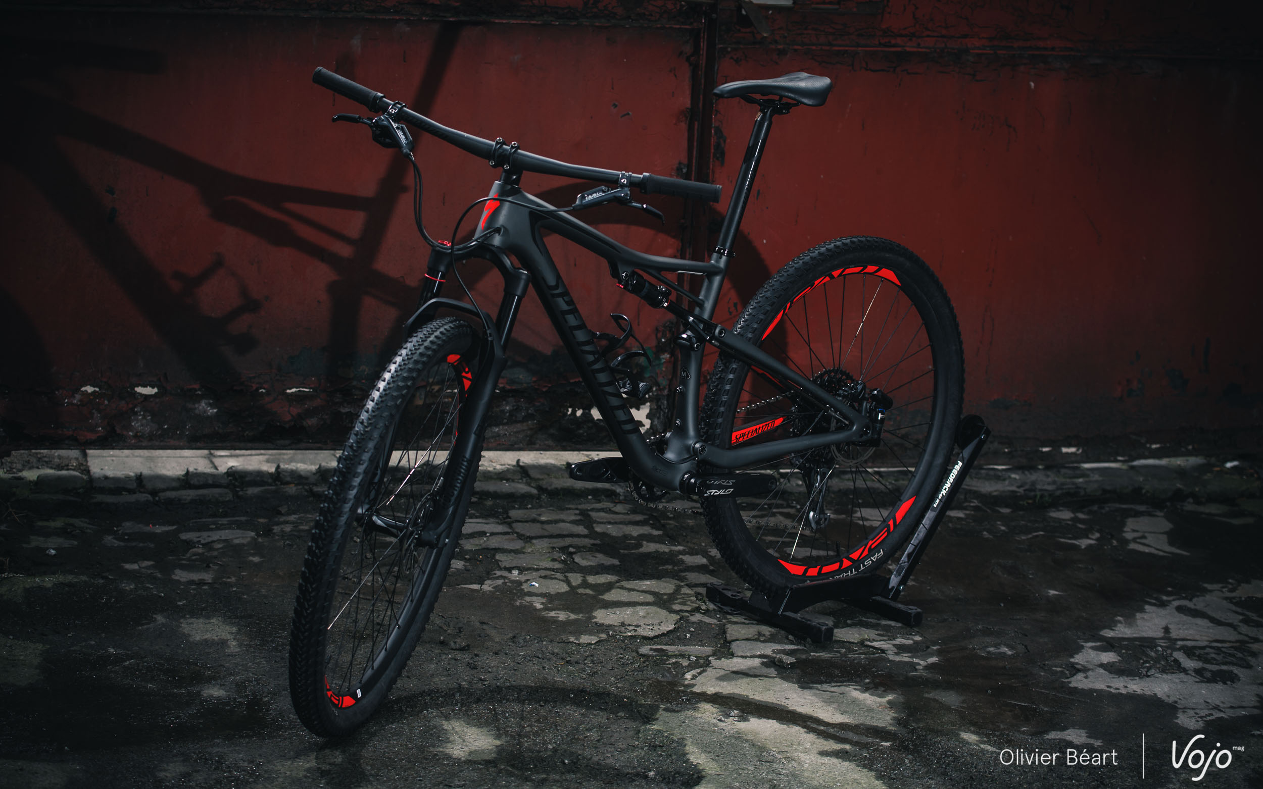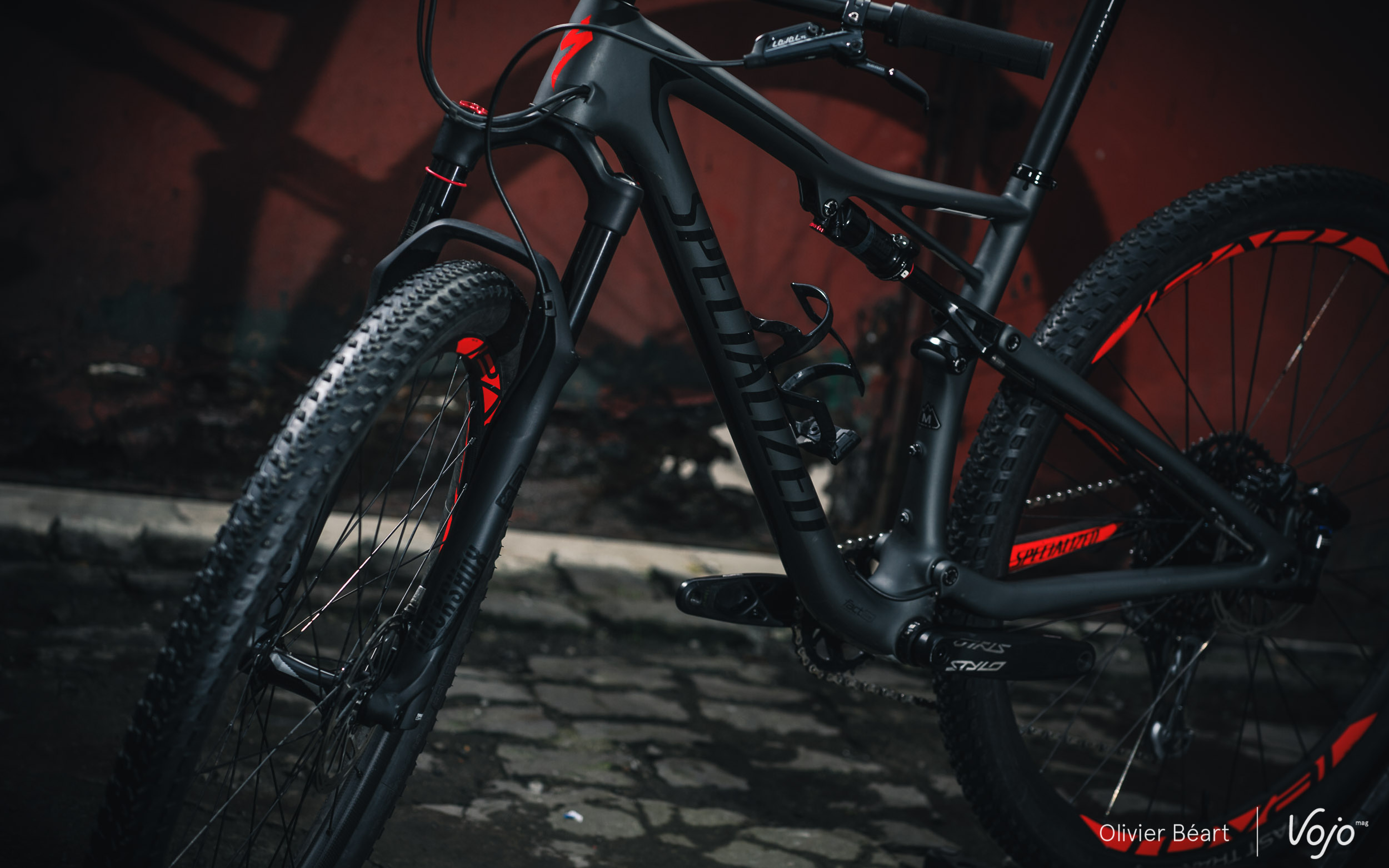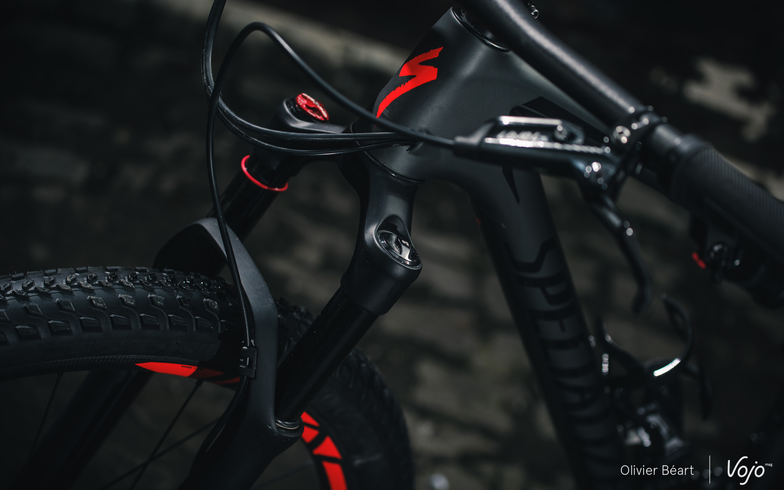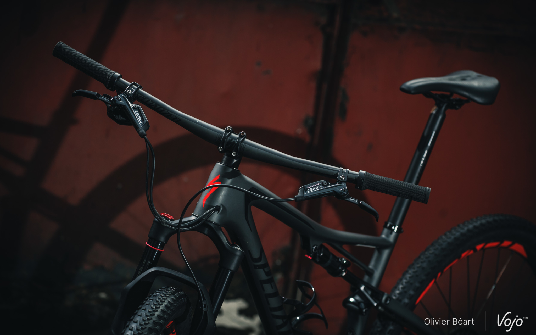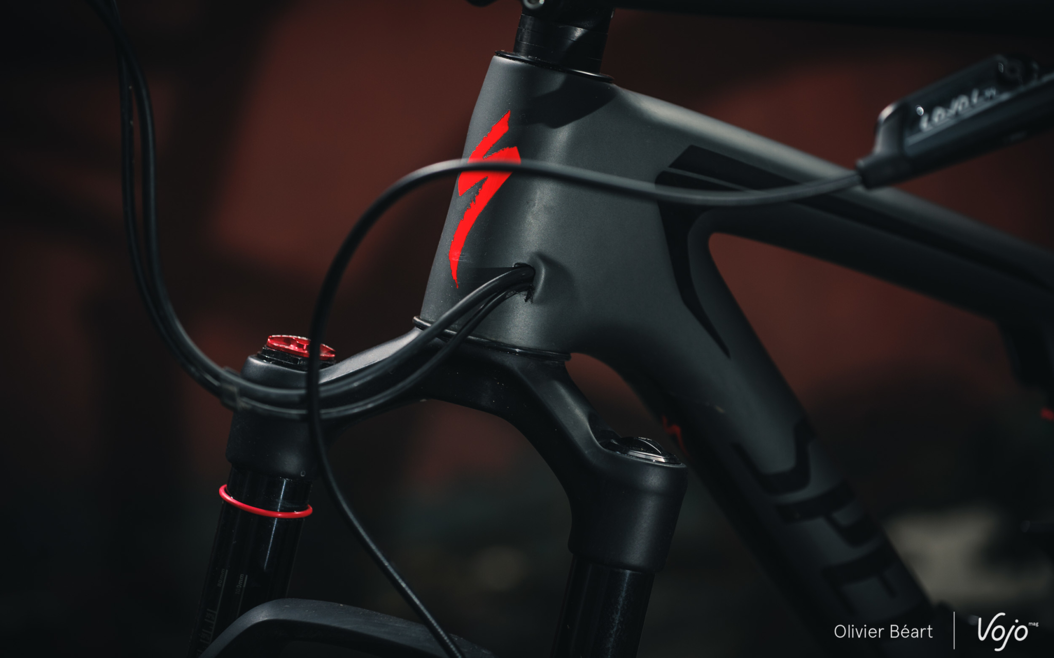 Si certaines marques ont initié des évolutions radicales dans la catégorie, comme Scott avec le Spark qui a évolué en profondeur sur ce point lors de la sortie du dernier millésime, Specialized a choisi des évolutions nettement plus douces. La profondeur du cadre (reach) n’a rien de démesuré (433mm en taille M, soit 1cm de plus qu’avant), mais elle s’allonge légèrement et la potence se raccourcit (75mm en M contre 90). Quant à l’angle de direction, il perd 1,5°, pour passer de 71 à 69,5°, et la douille de direction est plus basse qu’auparavant. C’est dans l’air du temps, et cela nous plaît. Par contre, les bases, déjà relativement courtes, ne bougent presque pas, avec 438mm.
