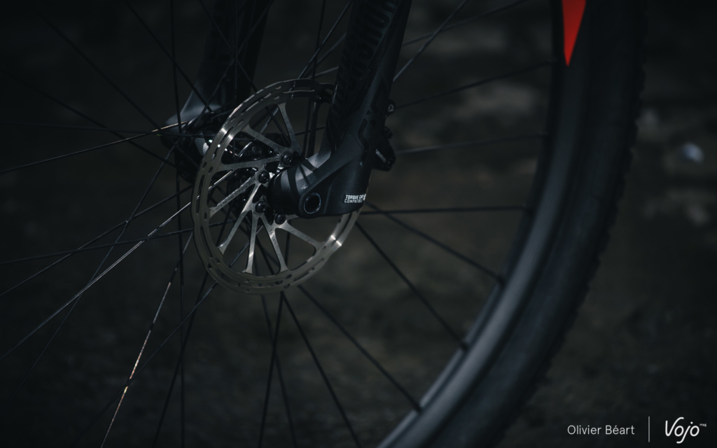 En descente pure par contre, le nouveau Specialized Epic reste un vélo un peu plus délicat à manier, principalement à cause d’un arrière qui reste assez haut et sur lequel on sent que le freinage a bel et bien tendance à verrouiller la suspension. Sans tige de selle télescopique (qui est vraiment à recommander sur ce vélo), dur de porter le poids suffisamment sur l’arrière pour faire rentrer la suspension dans le débattement, et le poids reste assez fort porté sur l’arrière. Ici, un Spark RC reprend l’avantage, mais c’est son gros point fort. Il faut aussi composer avec un freinage un peu juste qui force à anticiper, mais on peut améliorer la situation facilement en changeant le disque avant par un 180mm.