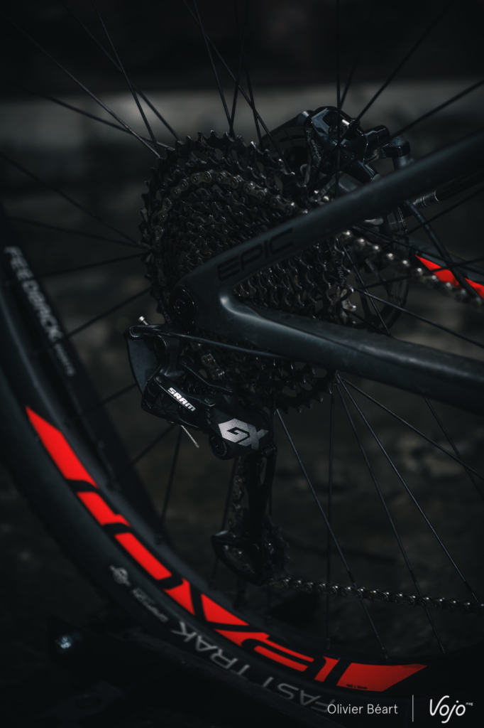 Pour la transmission, le Specialized Epic Expert est équipé d’une transmission Sram GX Eagle 12 vitesses. Il s’agit d’un inévitable au niveau de la polyvalence avec sa cassette 10/50 dents, bien utile dans la mesure où le nouvel Epic ne peut recevoir de dérailleur avant. Mais qui roule encore en double en XC aujourd’hui ? Cependant, si nous apprécions ce groupe au niveau de sa philosophie, nous avons rencontré de nombreux soucis avec le dérailleur arrière lors du test : prise de jeu, blocage de la chaîne entre le galet et la chape, etc. Après un changement, le test a pu continuer. Mais nous tenons cela à l’œil !
