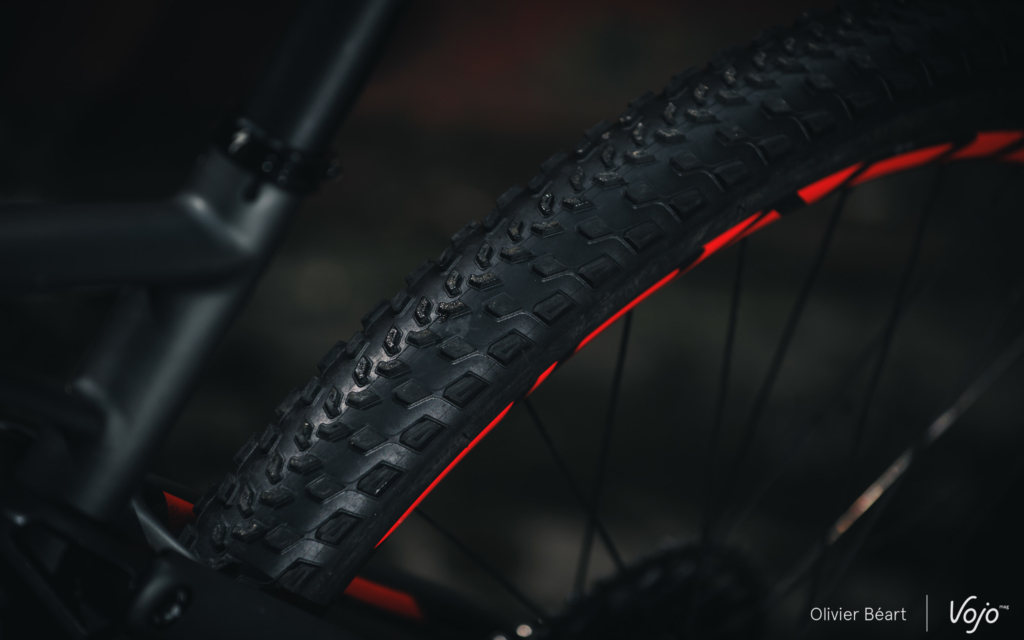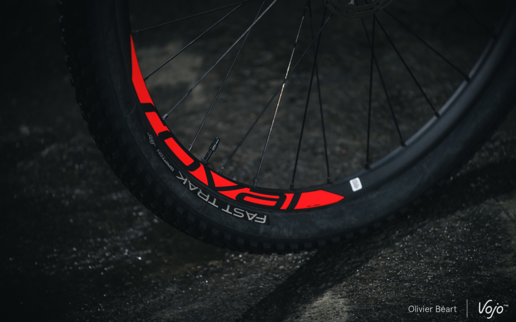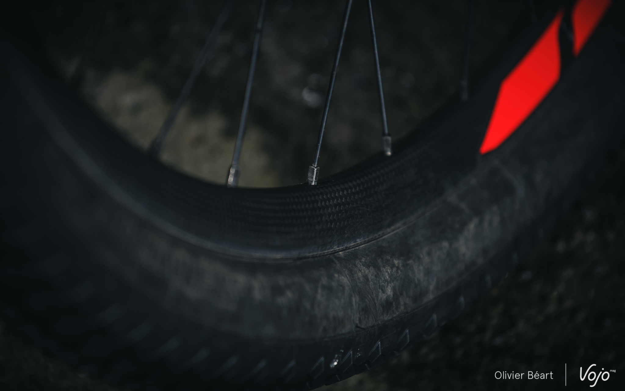 Ces roues sont montées avec les excellents pneus Specialized Fast Track en 2.3 devant et 2.1 derrière. Cette différenciation est très intéressante, dans le sens où on augmente le grip devant et où on joue le gain de poids derrière. La gomme Gripton de ces pneus est exceptionnelle et leur solidité en version Grid excellente.
