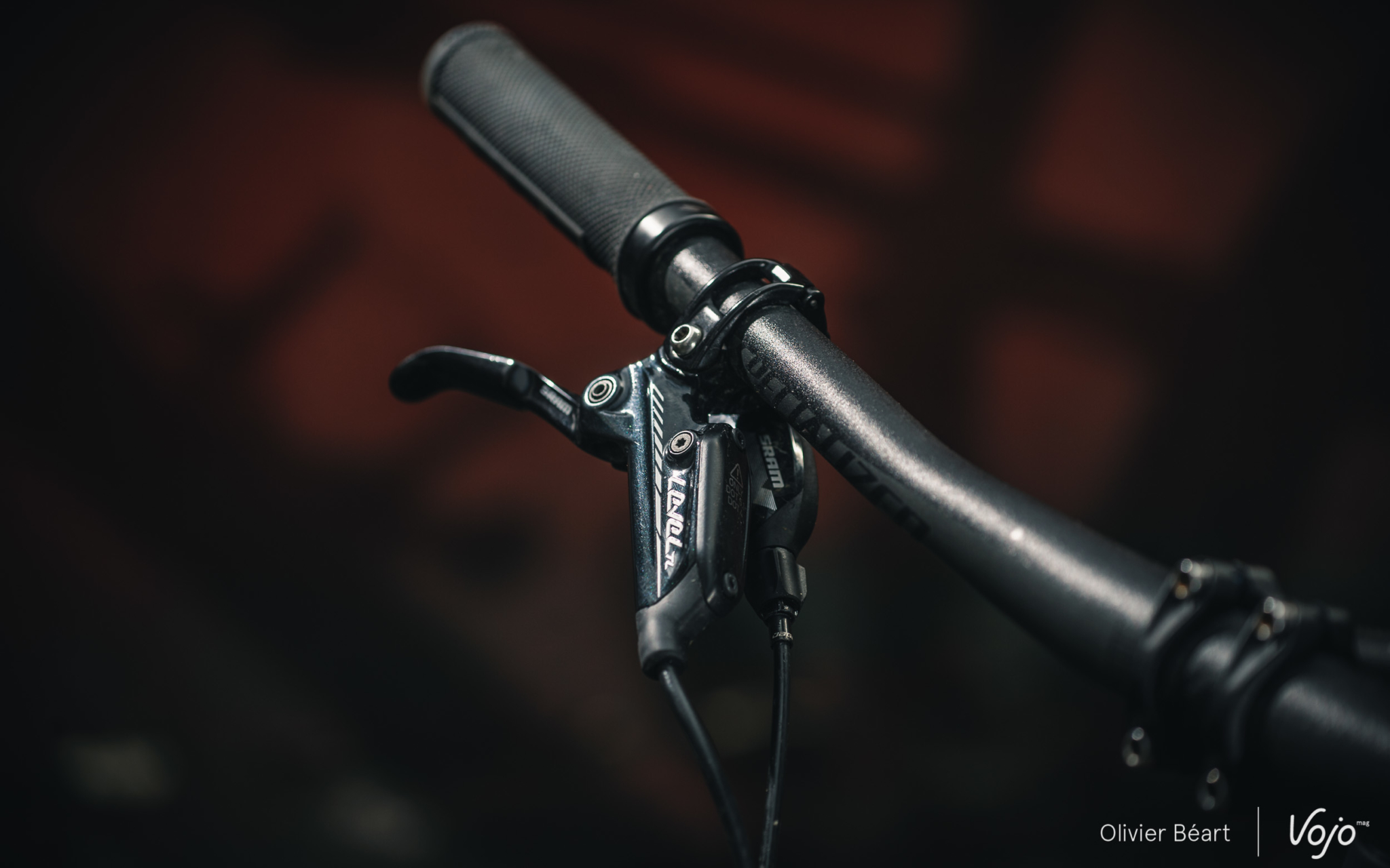 Enfin, au niveau des freins, Specialized a sélectionné les Sram Level TL. Situés en entrée de gamme, ils mélangent un levier identique aux Level TLM plus haut de gamme, mais ils conservent des étriers de précédente génération. Leur puissance est un peu juste, surtout devant, où le disque de 160mm devrait céder la place à un 180 pour avoir des décélérations en rapport avec les capacités de la machine.