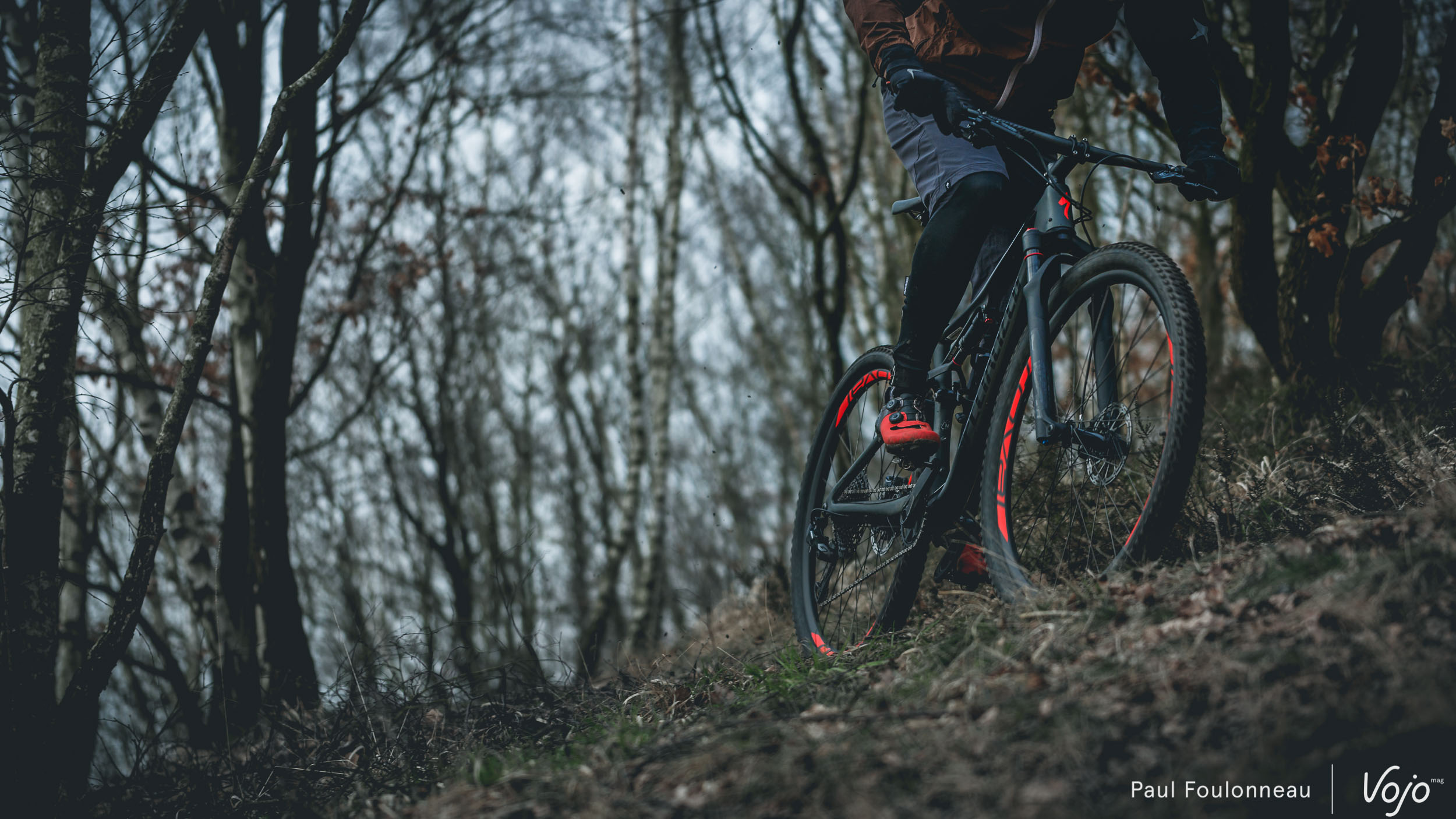 Même si la suspension devrait être, en théorie, un peu moins sensible de par la disparition du point de pivot Horst Link, le nouveau Brain compense largement et le vélo nous a paru d’un grand confort sur les petits chocs et les vibrations type ornières de tracteur. Dans une optique marathon, c’est un point important. Le cadre n’a rien d’hyper exigeant non plus, et il donne l’impression de rendre le contact avec le sol feutré, presque doux, tel un félin avançant sur la pointe des coussinets. Le grip en côte est aussi remarquable. Mais pour profiter de tout cela, il faut prendre soin et le temps de bien régler tous les paramètres, des suspensions à la pression des pneus.