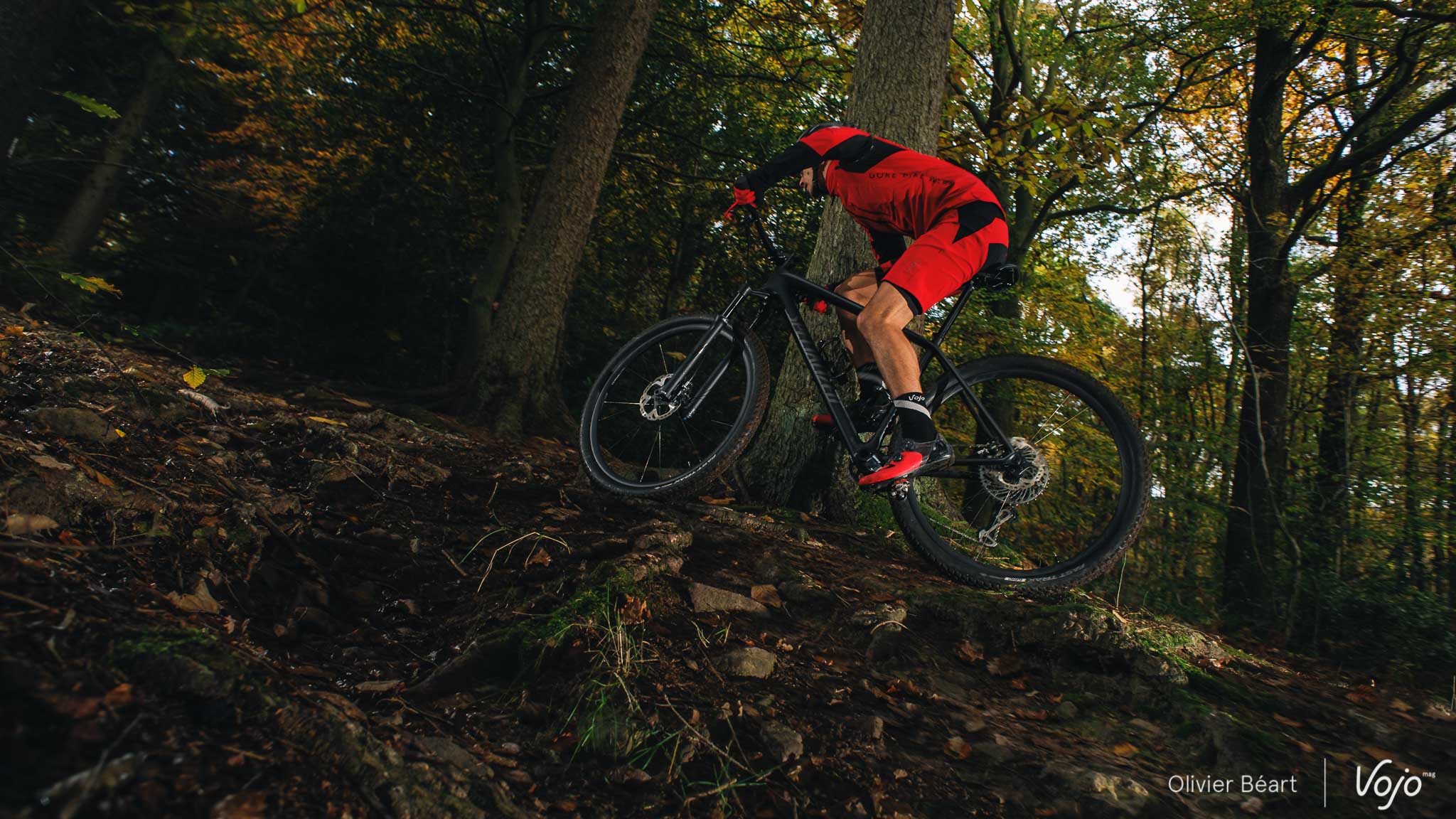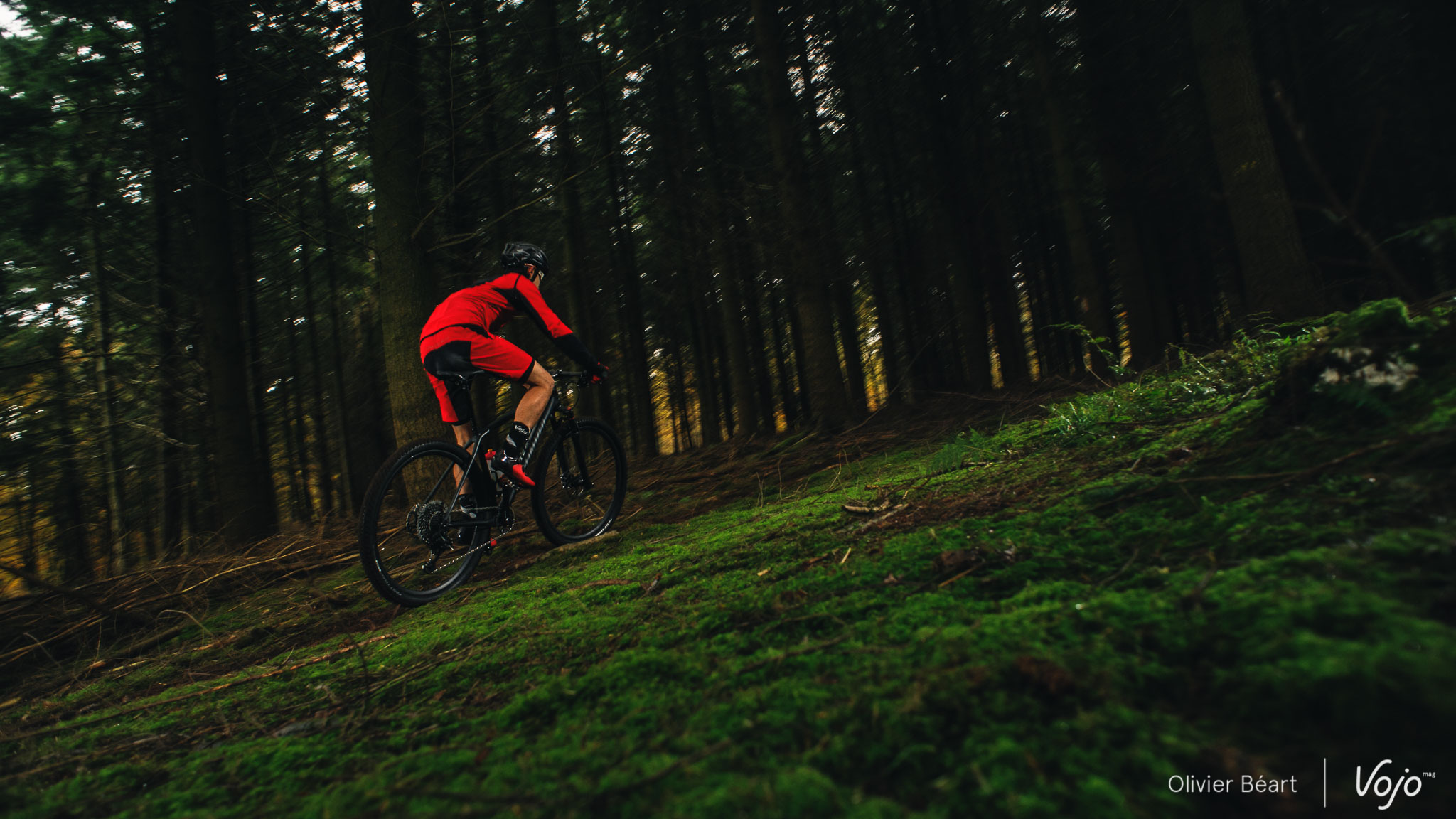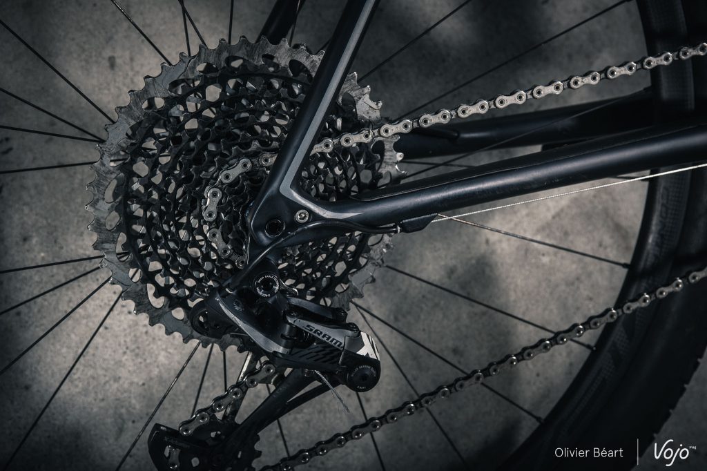 Là où il fait par contre assez nettement mieux, c’est dans les grimpettes techniques où le cadre capable de se déformer verticalement et les pneus bluffants forment un couple redoutable pour venir à bout des pires côtes. L’équilibre est également très facile à trouver pour garder l’adhérence du pneu arrière tout en gardant la roue avant bien plaquée au sol. Quant au groupe Sram XO1 Eagle, il offre aussi une sécurité bien agréable avec son pignon de 50 dents, histoire de ne pas caler même dans les forts pourcentages. On aurait même pu imaginer avoir un plateau de 34 dents devant pour avionner encore plus sur le roulant, mais c’est un détail.