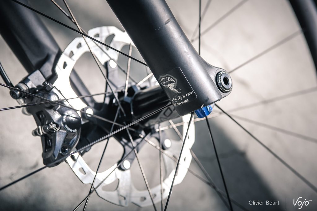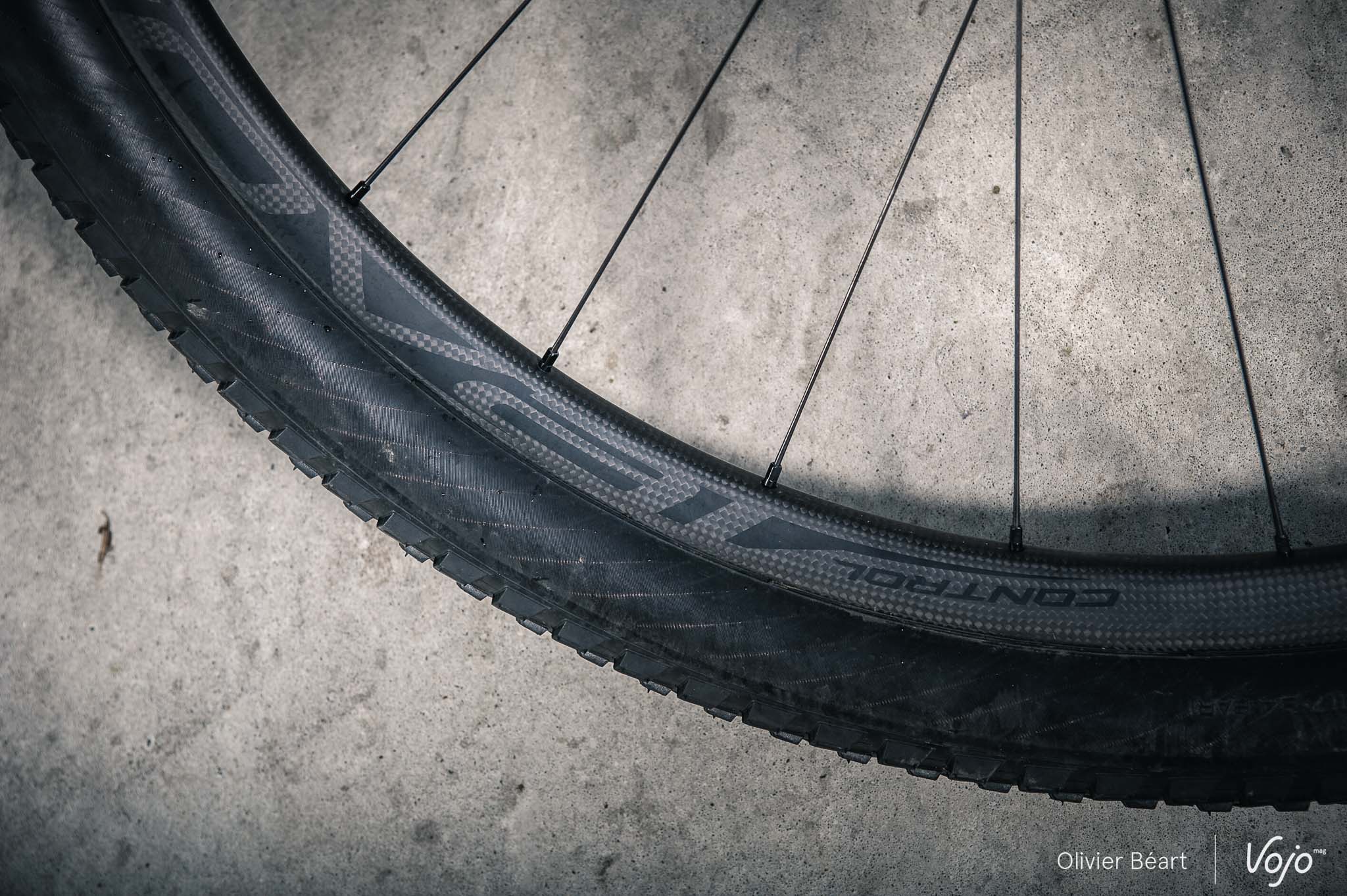 Point crucial, si quelques équipements trahissent un souci d’économie dans le chef de Specialized, on ne peut que se réjouir de voir la présence des excellentes roues Roval Control Carbon. Avec 1580g annoncés, ce ne sont pas les plus légères, mais leur rigidité et le format de la jante (27mm externe/22mm interne) apportent un petit plus sur ce genre de plateforme. Elles sont normalement chaussées de pneus Specialized FastTrack 2.2 en carcasse Control, mais sur notre modèle test, ils ont été remplacés avantageusement par une nouvelle version 2.3 dotée de la gomme Gripton… qui nous a vraiment étonnés. A elle seule, elle donne une polyvalence que nous ne connaissions pas au FastTrack, surtout à l’avant où l’accroche est phénoménale y compris sur le mouillé.