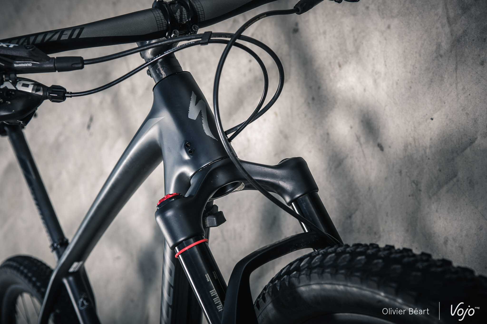 Au final, tout cela paie, puisque le cadre du Specialized Epic HT en version S-Works (fibres Fact 11M), ne pèse que 875g, soit 300g de moins que la précédente génération. Et cela en fait le cadre le plus léger jamais conçu par Specialized, route et VTT confondus. Quant au cadre en fibres Fact 10m testé ici, il est un peu au-dessus de 1100g, mais il reste plus léger que l’ancien S-Works et aussi dans la moyenne des cadres carbone de « deuxième niveau » chez la concurrence. Complet, notre vélo de test sort à 9,64kg complet en taille L. Un très joli score !