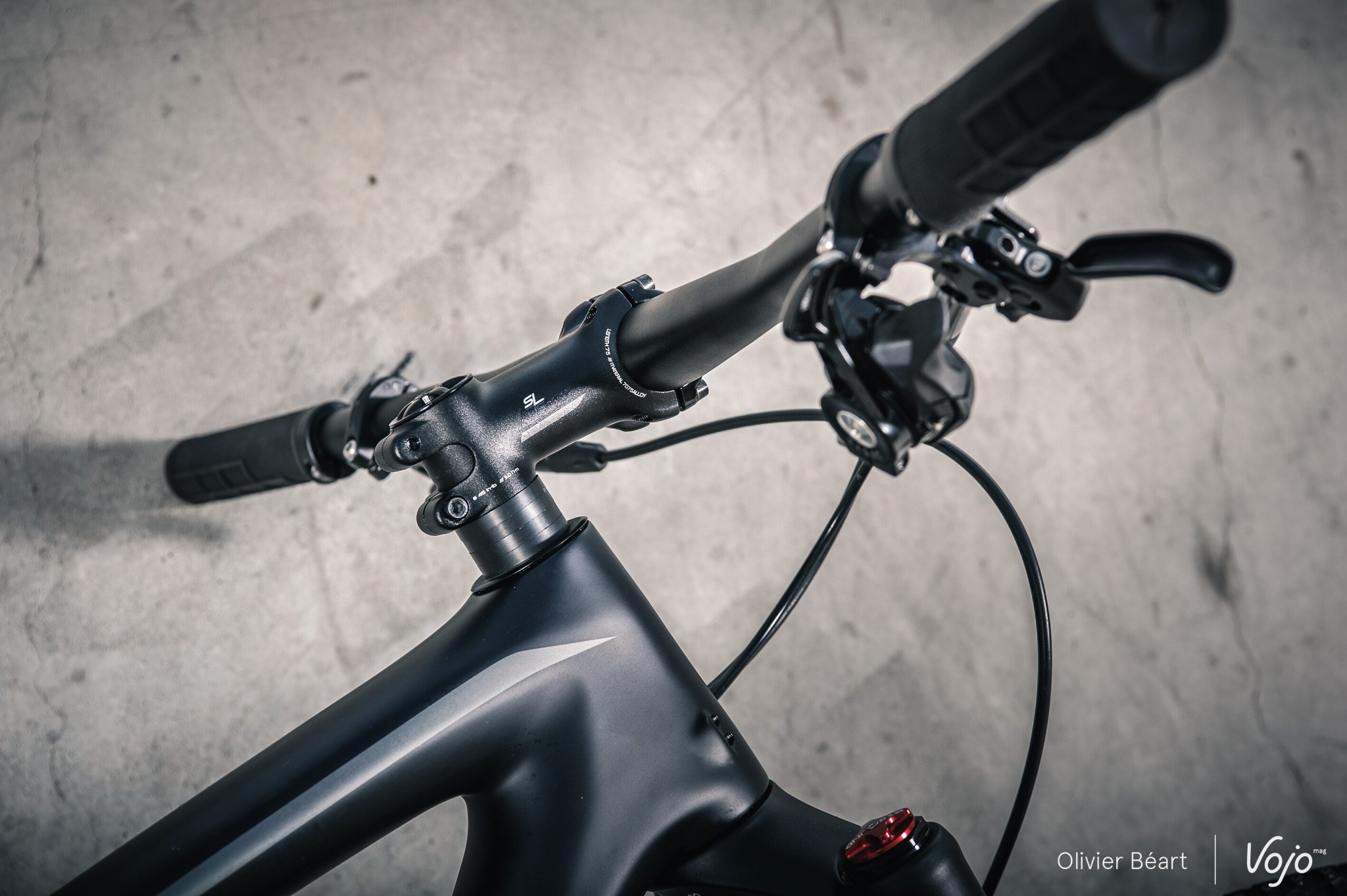 Ici par contre, on peut dire que Specialized a travaillé dans la continuité du Stumpjumper HT que l’Epic remplace. Même si la tendance est à l’allongement du reach vers des valeurs « extrêmes », il n’est pas du tout question de cela ici. Avec 418mm en taille M, on est par exemple un bon centimètre plus court que le nouveau Scott Scale. Le tout est couplé à une potence assez longue (90mm en M), et à un angle de direction de 69,8°. C’est nettement plus couché que sur son prédécesseur mais on est loin des 68,5° d’un BH Ultimate ou du Scale. Et pourtant, comme nous le verrons plus loin… ça marche sacrément bien quand même !