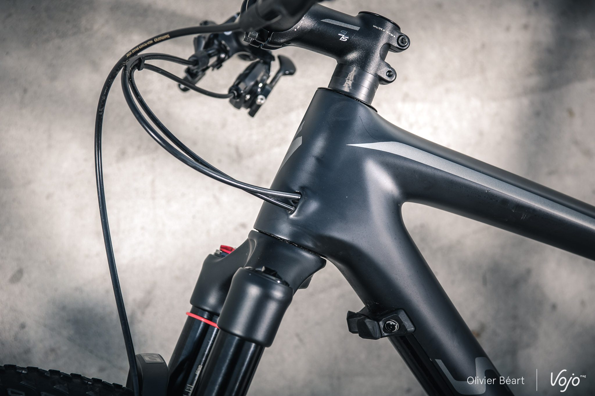 Un exemple : le passage interne des câbles, dont les entrées et sorties sont un mélange de design et de technique. Pour des raisons pratiques (pas de frottements) et de résistance (c’est là qu’il y a le plus de matière), les ingénieurs voulaient une entrée au niveau de la douille. Les designers se sont chargés de l’intégration, alors que les responsables techniques ont poursuivi leur travail pour qu’à l’intérieur, les câbles suivent le chemin le plus direct possible et soient faciles à récupérer pour les mécaniciens sans avoir recours à des guides comme sur le Stumpjumper, jugés trop lourds. En tout, cette solution permet de gagner 30g sur les gaines. Il n’y a pas de petit profit.