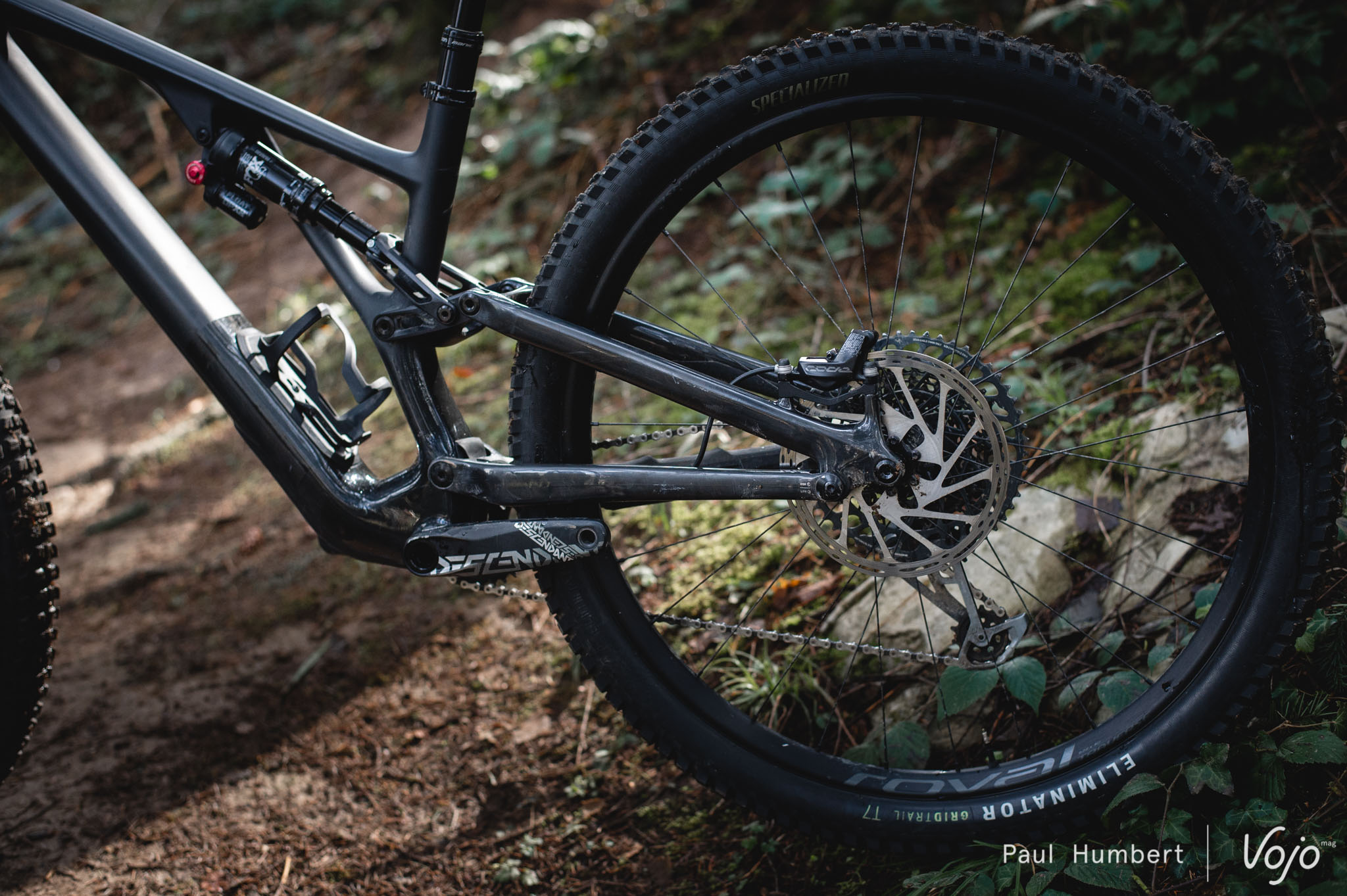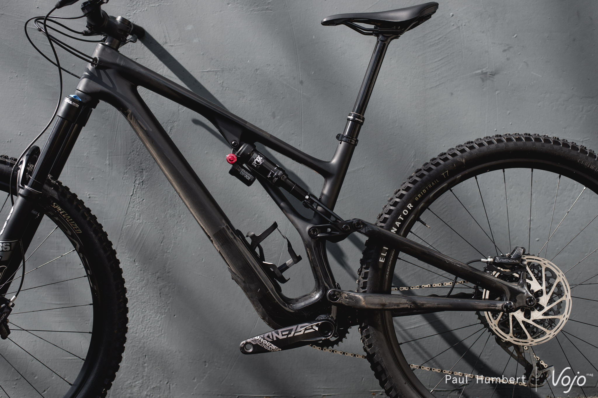 Côté train roulant, c’est du 100 % Specialized puisqu’on a droit à des roues Roval Traverse 29 en 30 mm de largeur interne (annoncées à 1780 g) chaussées de pneus Butcher (avant) et Eliminator (arrière), en section de 2,3″ et carcasse Grid Trail. On notera que les mélanges de gommes sont différents entre l’avant et l’arrière, avec du tendre T9 devant et du T7 plus résistant derrière.