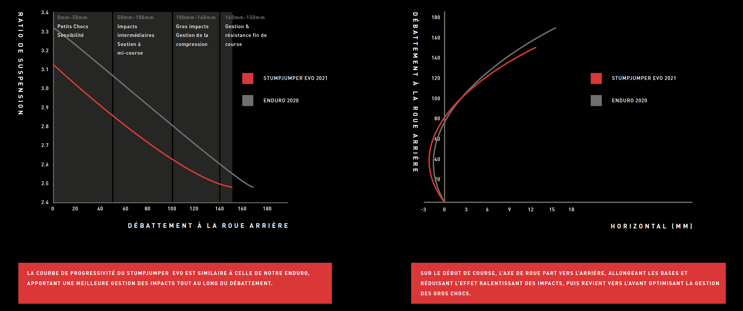 On notera qu’à l’avant, le débattement varie en fonction de la taille du vélo : il est de 150 mm en S1 puis de 160 de S2 à S6.