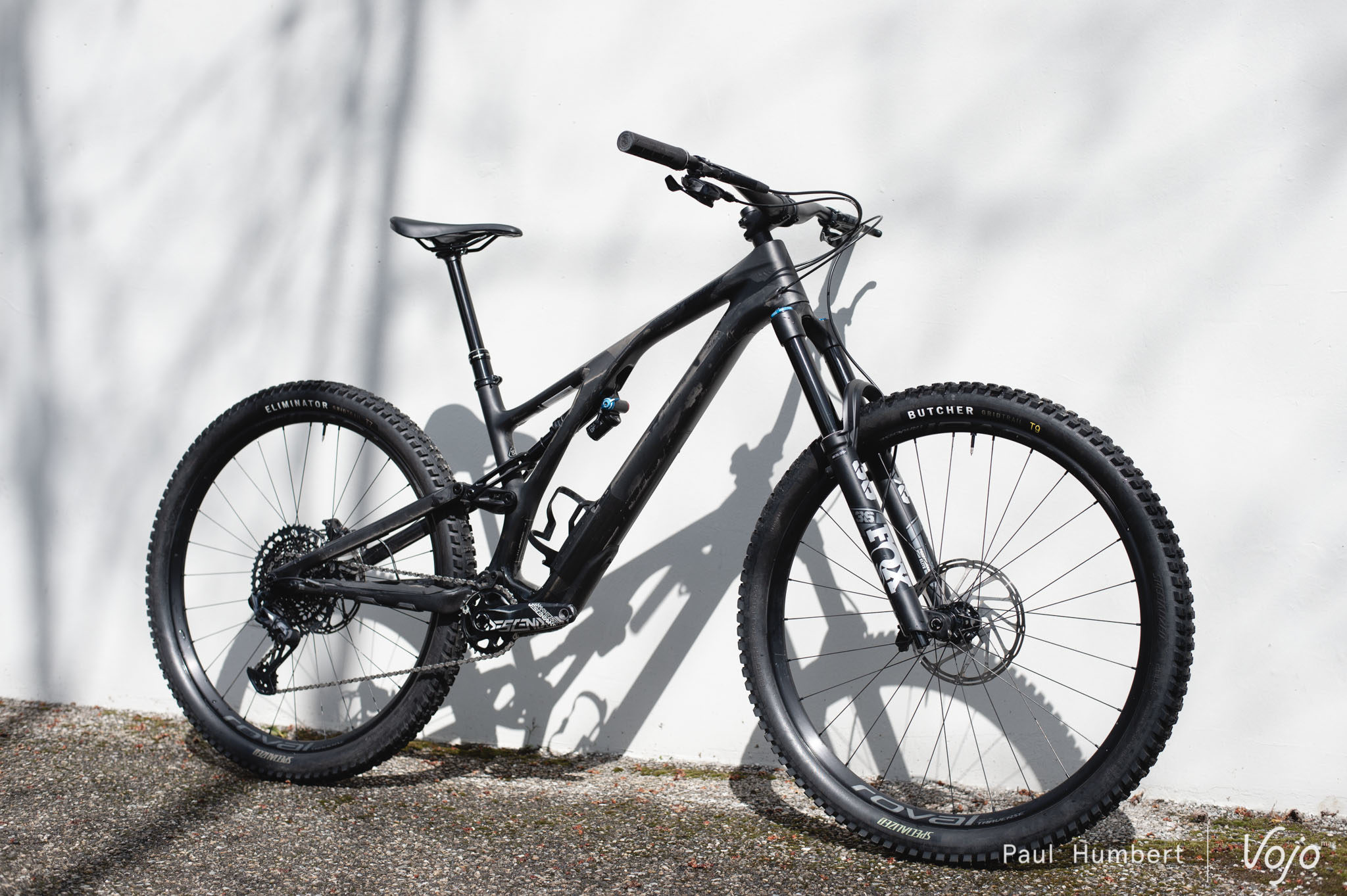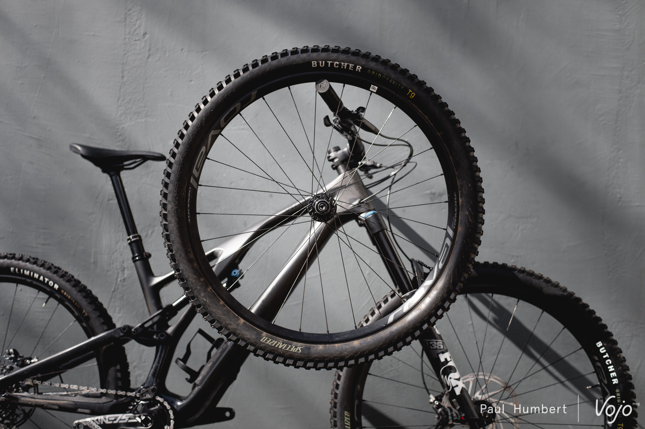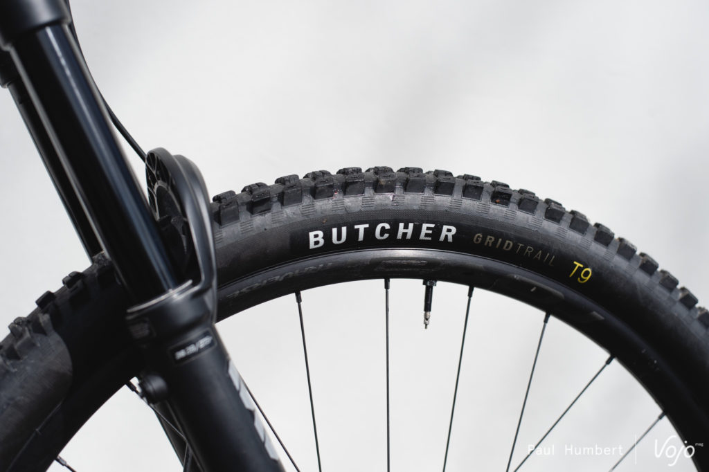 Côté train roulant, c’est du 100 % Specialized puisqu’on a droit à des roues Roval Traverse 29 en 30 mm de largeur interne (annoncées à 1780 g) chaussées de pneus Butcher (avant) et Eliminator (arrière), en section de 2,3″ et carcasse Grid Trail. On notera que les mélanges de gommes sont différents entre l’avant et l’arrière, avec du tendre T9 devant et du T7 plus résistant derrière.
