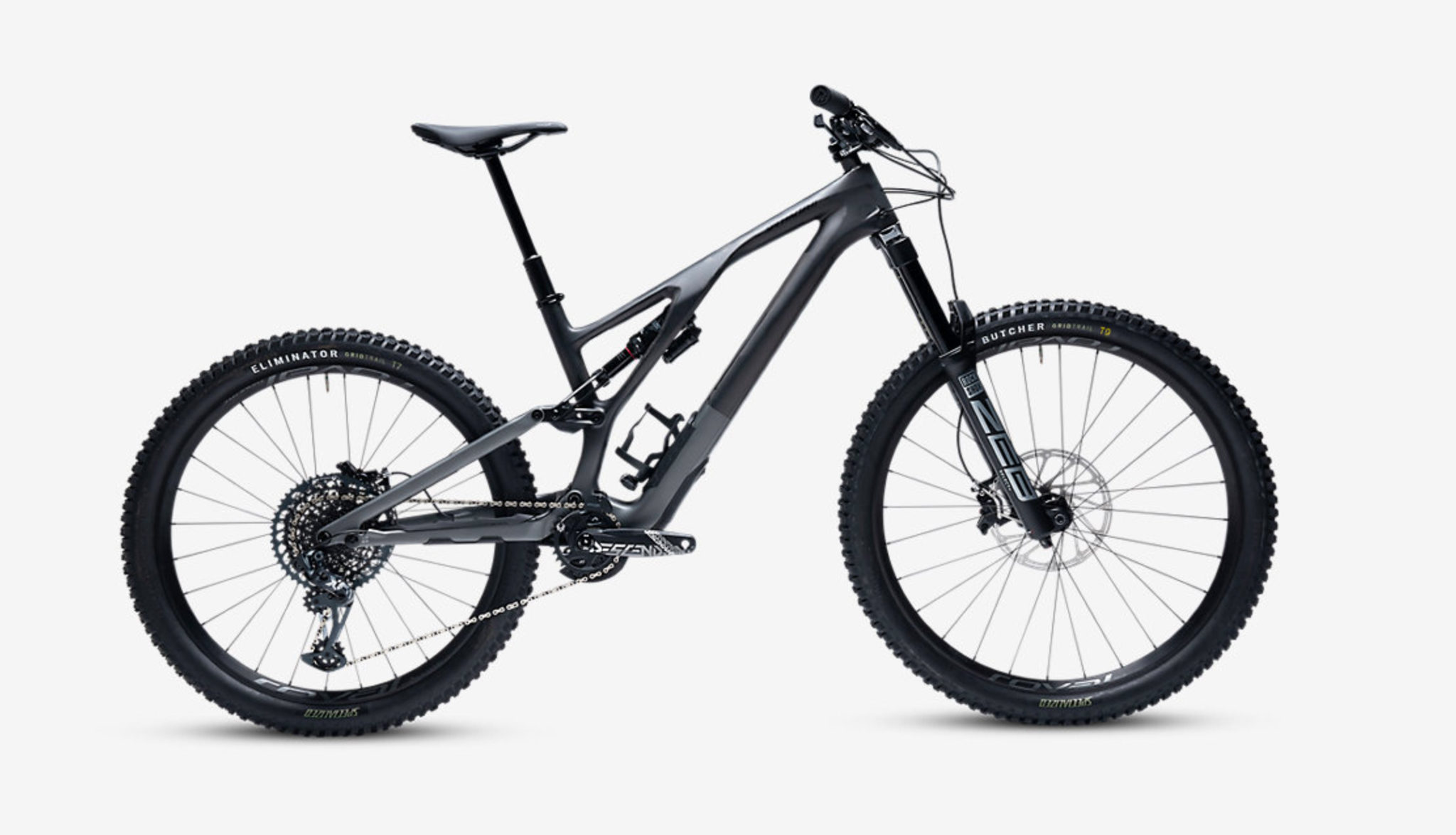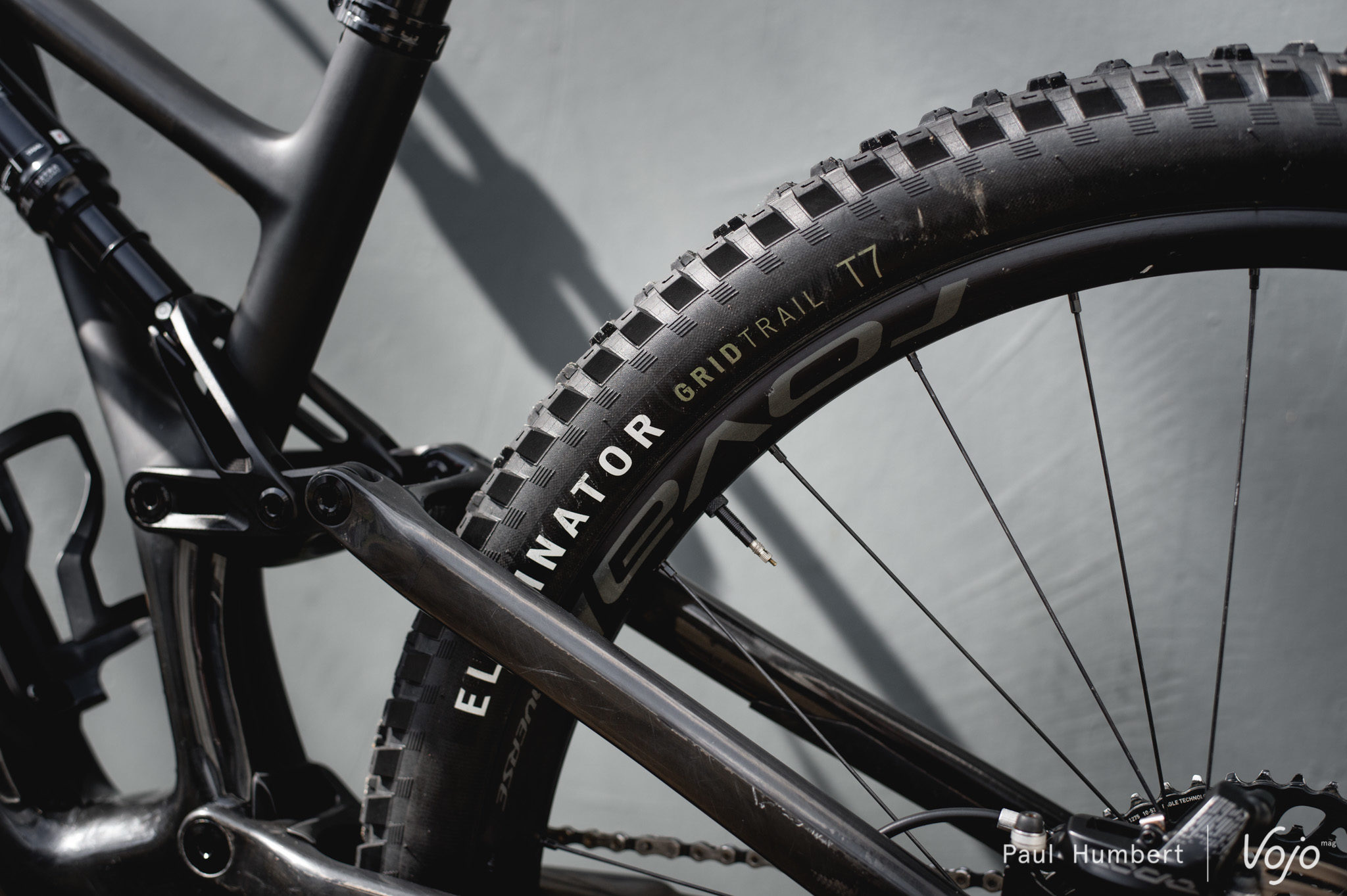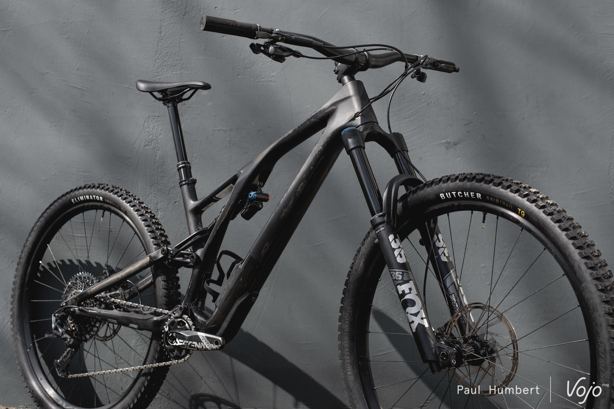 Côté train roulant, c’est du 100 % Specialized puisqu’on a droit à des roues Roval Traverse 29 en 30 mm de largeur interne (annoncées à 1780 g) chaussées de pneus Butcher (avant) et Eliminator (arrière), en section de 2,3″ et carcasse Grid Trail. On notera que les mélanges de gommes sont différents entre l’avant et l’arrière, avec du tendre T9 devant et du T7 plus résistant derrière.