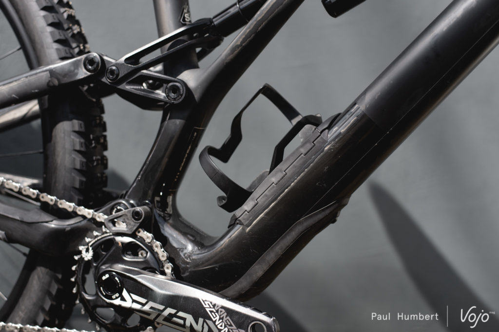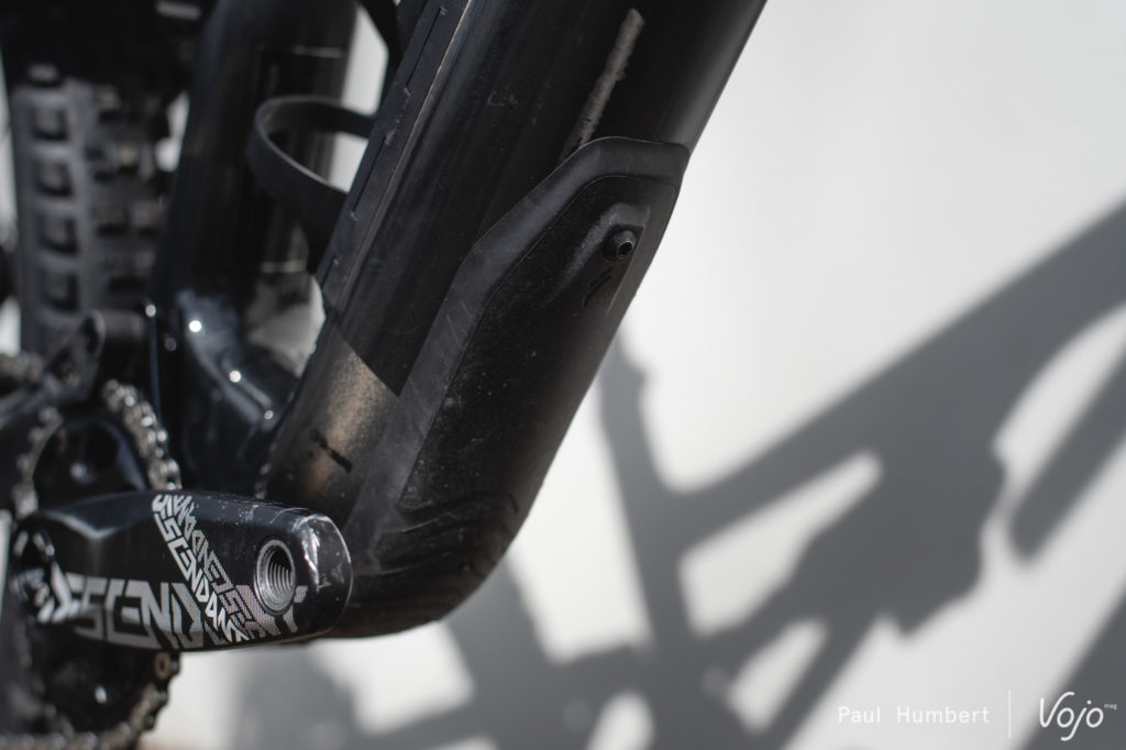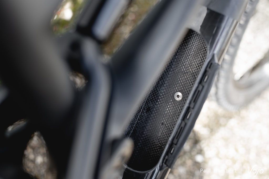 Quant aux protections, elles sont plutôt classiques mais de belle facture. On note que celle placée sur le tube diagonal est fixée par des vis et peut se retirer. Cela donne accès à une grande trappe dans le cadre, de quoi faciliter encore les opérations de maintenance et de passage des gaines.