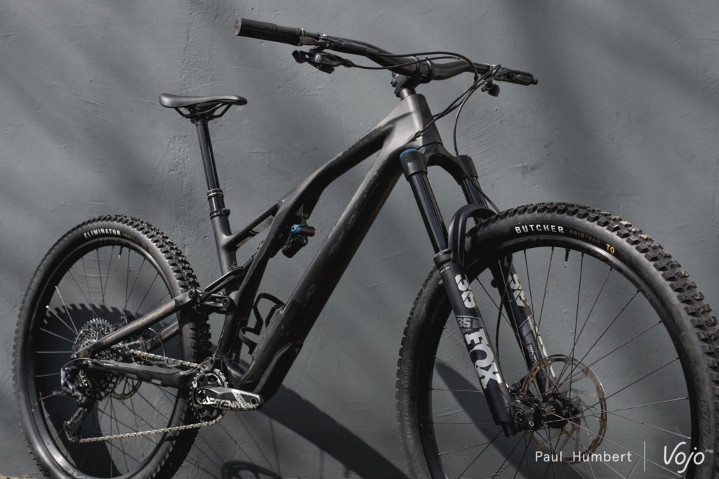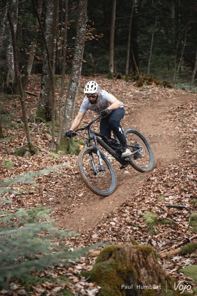 Nous commençons ce test avec la géométrie en configuration d’origine (29″, boîtier haut et direction intermédiaire). En montant sur le vélo, on se sent très bien installé, comme toujours sur un Specialized. Le dos est bien droit et le petit plateau invite à tourner les jambes, tandis que la suspension et sa capacité assez incroyable à effacer le moindre petit caillou garantit un confort de haute volée.