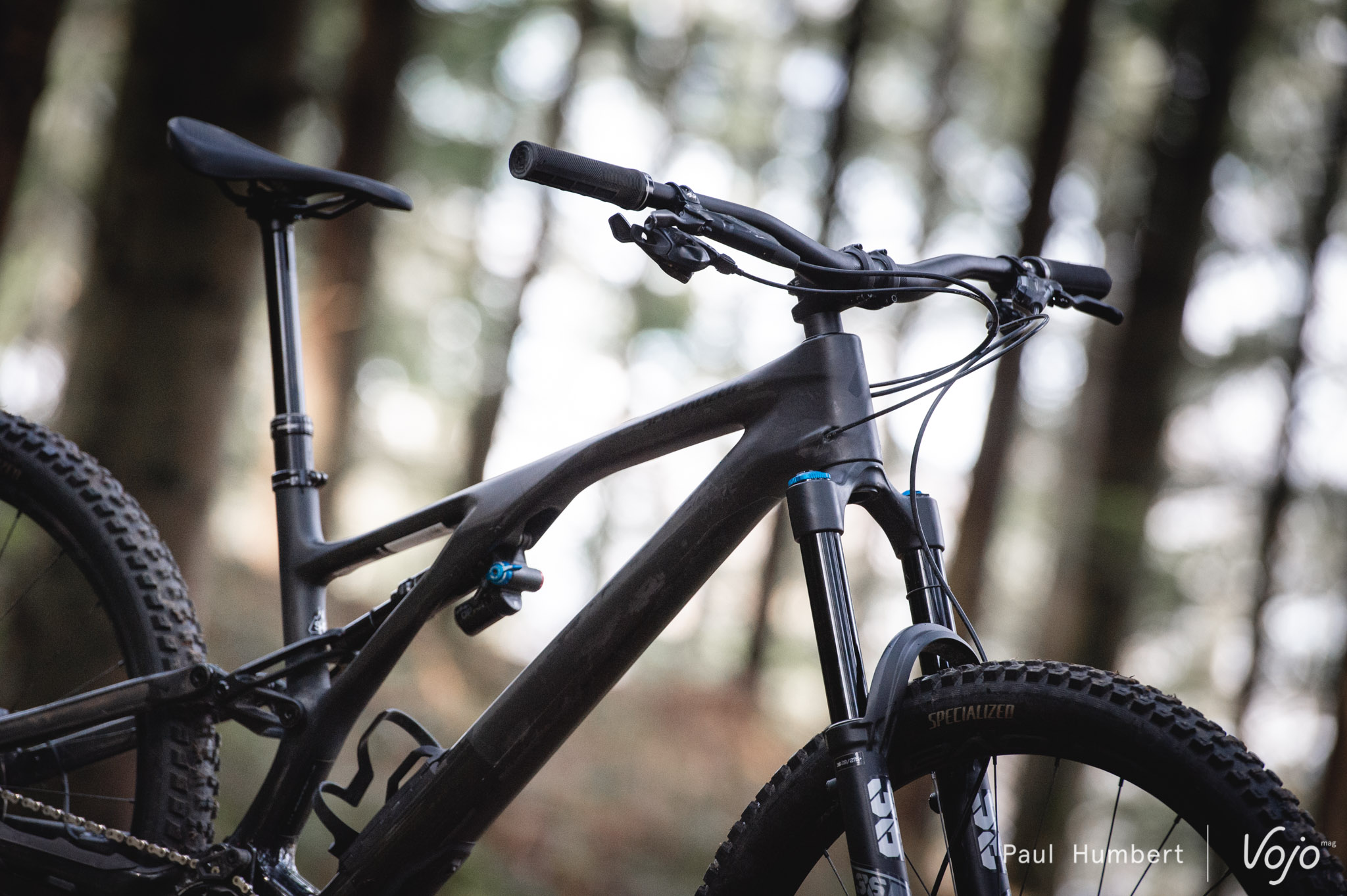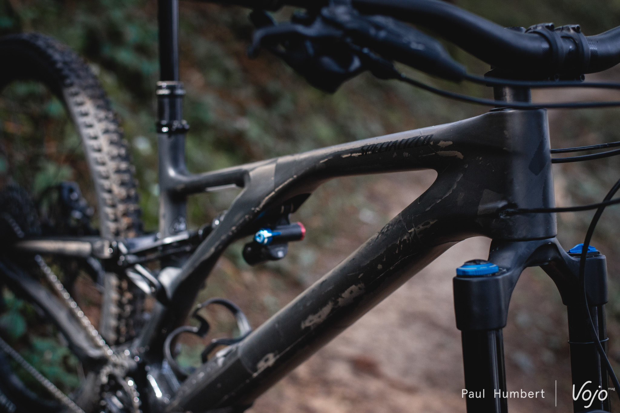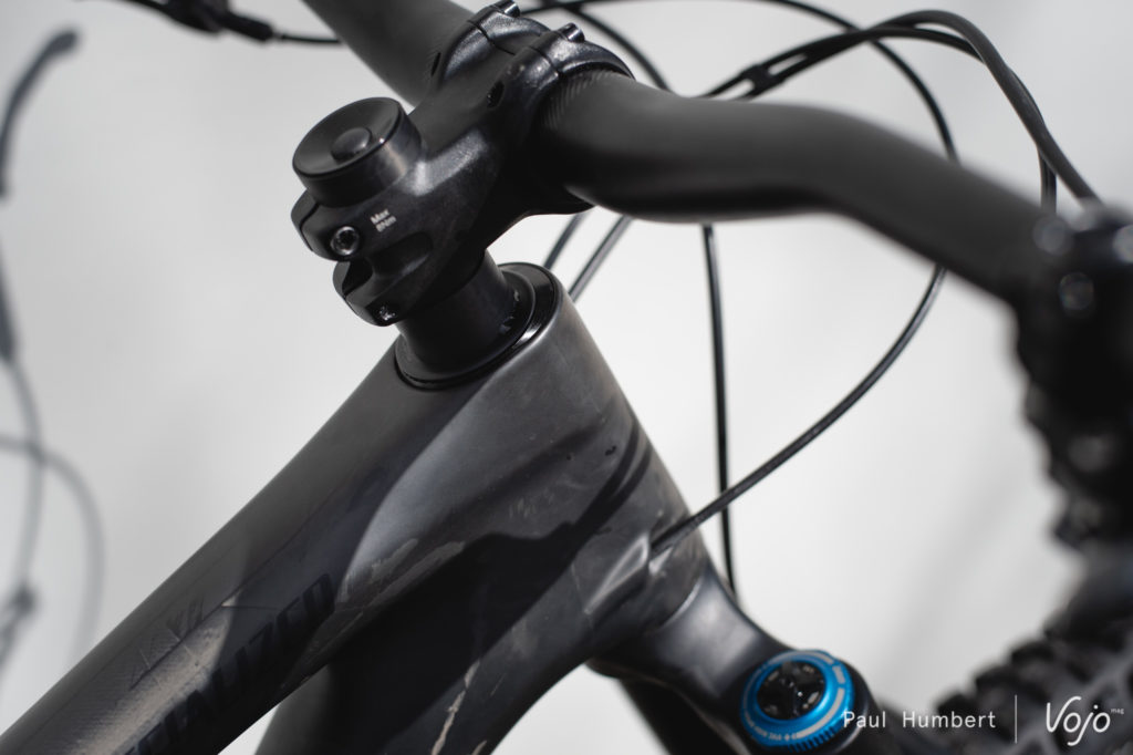 Entièrement en carbone à l’exception de la biellette et du yoke (le « Y » qui relie l’amortisseur à la biellette), le Stumpjumper Evo Expert est très discret dans cette couleur noire qui répond au doux nom de Satin Gloss Carbon / Smoke. En s’approchant, on remarque toutefois que cette finition laisse le carbone apparent sur presque tout le cadre, recouvert d’un simple vernis mat ou brillant selon les endroits. C’est assez original et on dirait presque que le cadre n’est pas fini, mais ça fait son petit effet et ça rend chaque vélo véritablement unique.