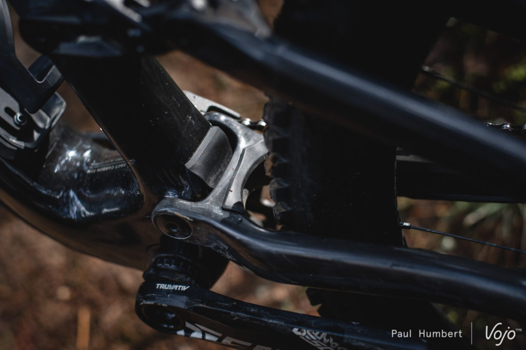 Si vous êtes du genre pointu ou bon pilote, vous pourrez sentir un certain manque de support dans la suspension arrière. Comme au pédalage, elle est très confortable à allure modérée, mais cette fois elle fait payer son confort par un « creux » à mi-course. Résultat, on consomme très vite ce débattement et on arrive vite sur la fin de course, beaucoup plus ferme. Sur le terrain, cela se traduit par un vélo qui a du mal à conserver le grip sur les gros freinages et qui a tendance à rebondir.