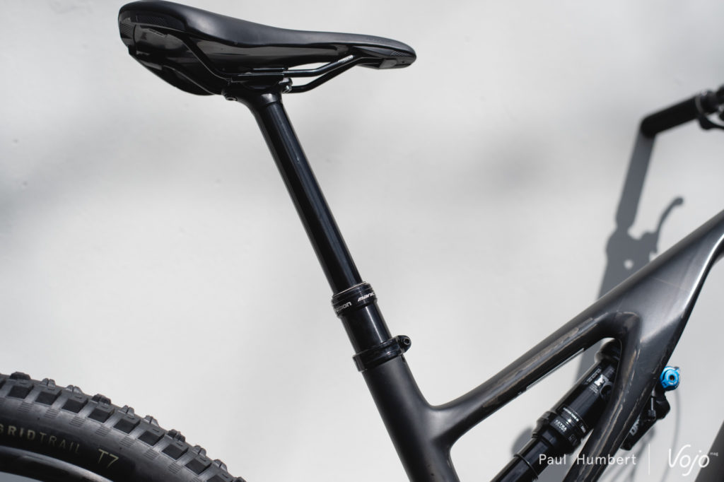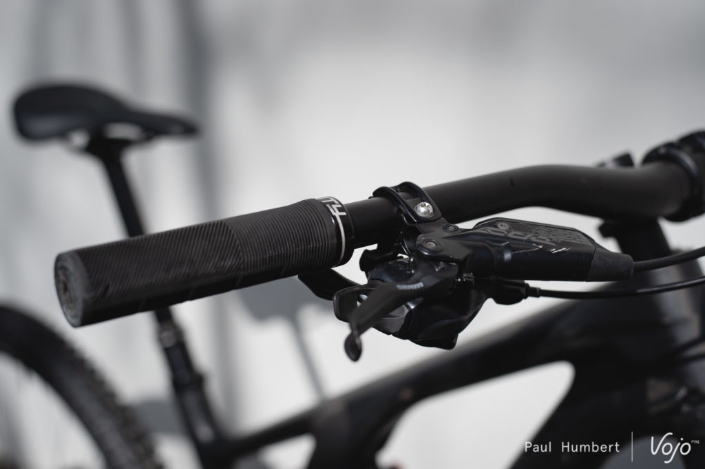Enfin, un peu d’originalité pour les périphériques puisque si la selle, la potence et le cintre sont siglés Specialized, la tige de selle télescopique est une X-Fusion Manic (débattement de 100, 125, 150, 170 ou 190 mm suivant la taille du vélo) et les poignées sont fournies par Deity, avec leur modèle Knuckleduster.
