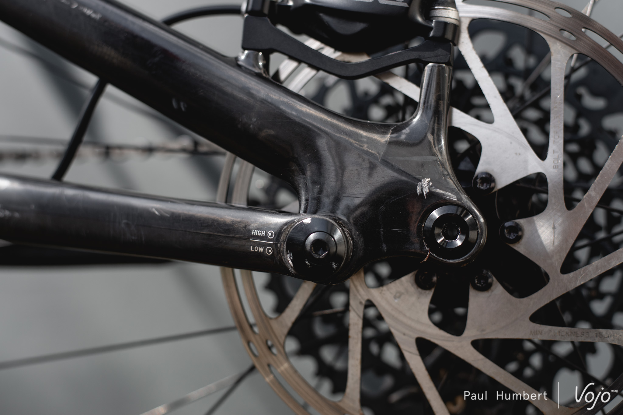 L’ajustement le plus simple, c’est la hauteur du boîtier de pédalier. Grâce à un petit flip-chip à deux positions situé sur le point de pivot entre les bases et les haubans, on la fait varier de 7 à 8 mm selon l’état des autres réglages. A noter que comme on touche au boîtier de pédalier, ce réglage influence aussi le reach et le stack, de 4-5 mm en moyenne. Ici, l’intervention se fait plutôt facilement puisque une fois qu’on a enlevé la roue, quelques tours de clé hexagonale 6 mm suffisent à desserrer la pièce et inverser sa position.
