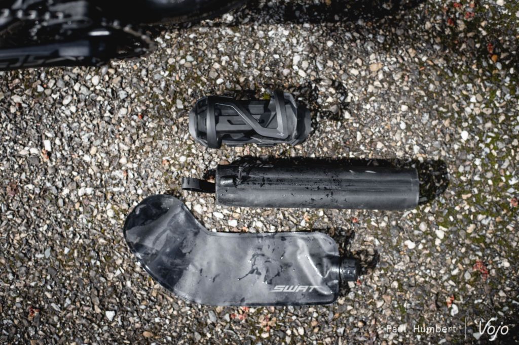 En dehors de cela, on retrouve les caractéristiques classiques des vélos Specialized, comme le stockage dans le tube diagonal Swat. Remanié pour l’occasion, il accepte une grande pochette ainsi qu’une flasque souple de 650 mL spécialement dessinée pour s’adapter au cadre. Face au Trek IFS, on a un plus de place mais c’est un peu moins organisé, il faut réfléchir un peu au placement de ses affaires pour éviter les bruits parasites.
