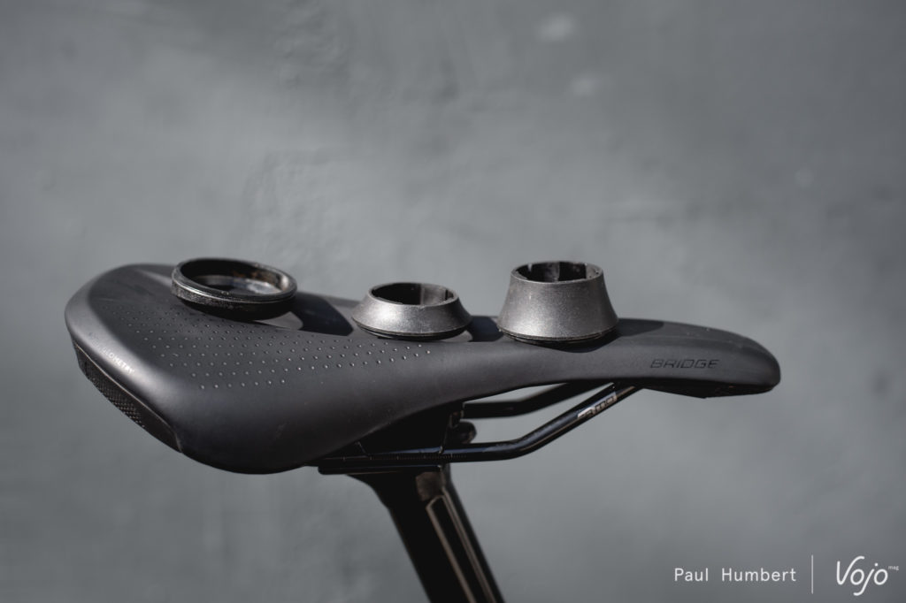 On peut également modifier l’angle de direction, avec deux coupelles qui permettent de choisir parmi 3 positions (une coupelle pour l’intermédiaire uniquement et une coupelle réversible couché/droit). Ce réglage influence aussi, dans une moindre mesure (environ 5 mm), la hauteur du boîtier de pédalier. On dispose également de trois capots de hauteur différente pour le jeu de direction, de façon à ajuster au mieux sa hauteur de potence sans utiliser trop d’entretoises.