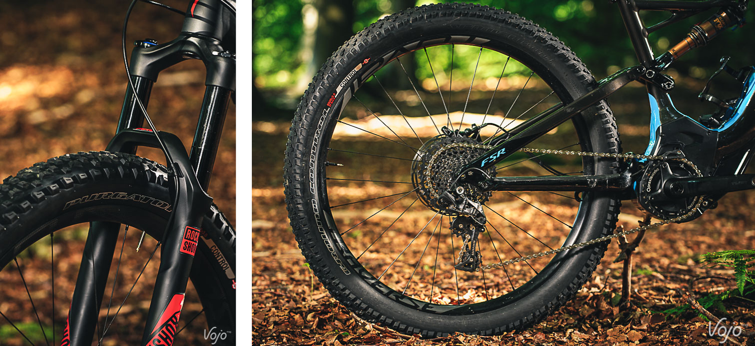 Specialized a aussi fait fort au niveau du choix des équipements : la fourche RockShox Pike est parfaite au niveau fonctionnement ainsi que de la rigidité et ses 140mm de débattement sont le bon compromis pour rouler en VAE comme on roule habituellement avec un vélo de all-mountain 120/130mm. Les adaptations de la suspension arrière permettent aussi de retrouver le comportement d’un Stumpjumper sans moteur, alors que les freins équipés de disques de 200mm permettent de s’arrêter en toutes circonstances. C’est une des leçons de ce test : en VAE, il ne faut pas hésiter à aller un cran au-dessus en pneus (3″ au lieu de 2.25), en suspensions (140mm au lieu de 120/130mm) ou encore en freins (disques de 200mm et étriers 4 pistons au lieu de 180/160mm en deux pistons) pour retrouver tout simplement un vrai vtt polyvalent.
