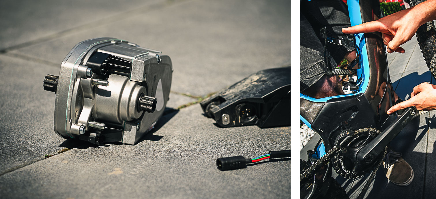 « Nous sommes aussi très fiers de l’intégration du moteur dans la châssis. Il est placé latéralement dans le cadre, par le côté droit. Sur le côté gauche, on trouve une pièce forgée avec une presse de 2500 tonnes, qui est une sorte de berceau pour accueillir le moteur. Les câbles passent aussi par là pour donner un look clean. Le tout est très facile à entretenir, avec un axe Isis facile à retirer, comme les roulements, des manivelles 4 branches classiques qui accueillent des plateaux 4 branches tout aussi standard. Et, contrairement à d’autres marques, on peut changer les braquets comme on le souhaite sans devoir reprogrammer quoi que ce soit. »