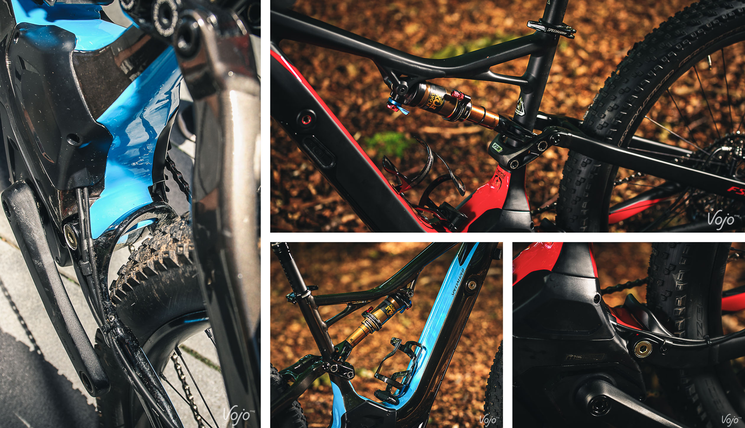 Au niveau de la cinématique, plusieurs lecteurs nous ont demandé s’il s’agissait d’un Stumpjumper ou si des changements avaient été effectués. « La cinématique a été adaptée, de même que l’amortisseur, en raison du surpoids. Mais le but des modifications est que le pilote retrouve les mêmes sensations que sur un Stumpjumper justement, avec un ratio identique. Nous avons aussi travaillé sur la durabilité, en doublant les roulements sur le pivot principal et la rigidité a aussi été améliorée en remettant le petit pontet entre les haubans ».