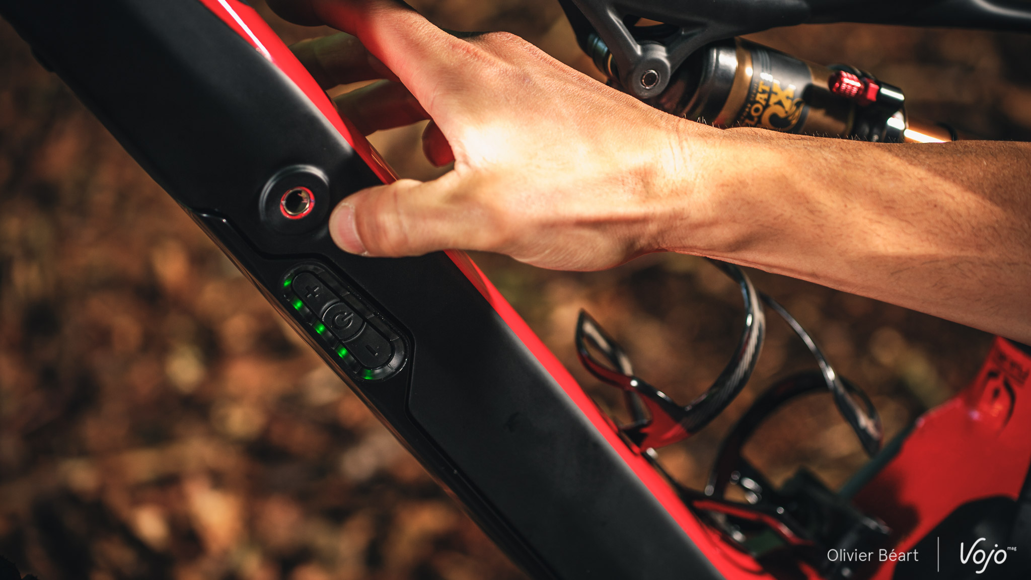 « Nous n’avons rien voulu mettre sur le cintre. Si le pilote le souhaite, il connecte le système à son smartphone ou à un GPS Ant+ pour avoir les infos, mais nous ne voulions pas d’un gros écran de contrôle lourd et complexe sur le cintre. Les seuls boutons et voyants sont sur le côté gauche du vélo avec un indicateur de charge par leds et les boutons +/- qui permettent de sélectionner le mode d’assistance : Eco, Trail et Turbo. »