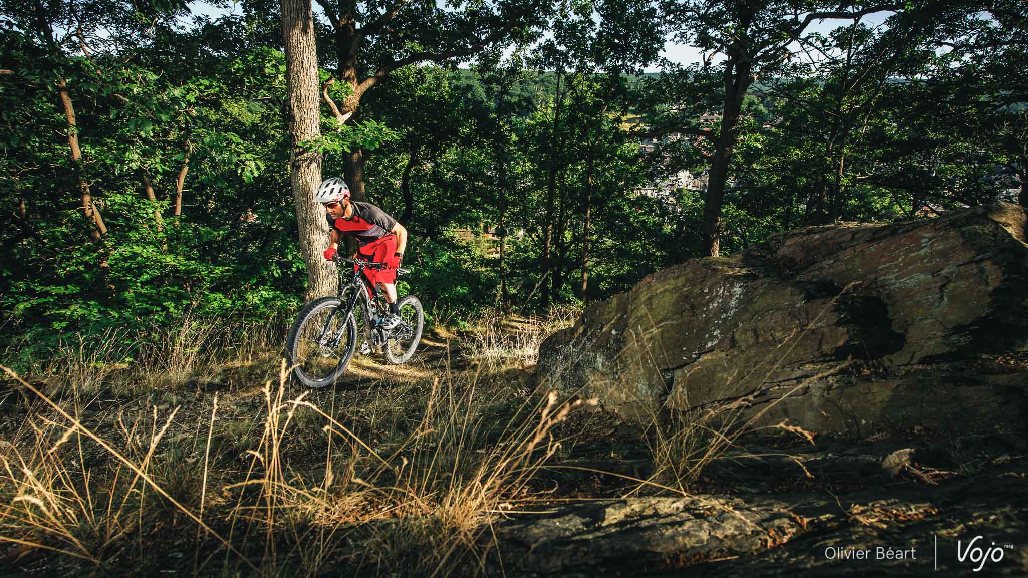 Sur le parking en vérifiant juste que tout est ok au niveau des réglages avant de partir dans les bois, on a déjà une première bonne surprise : on arrive à faire un peu ce qu’on veut avec le vélo ! Bunny-up, nose-turn, petits wheelings,… c’est un vrai petit jouet et malgré ses 21,06kg vérifiés (sans pédales), il ne donne pas du tout l’impression d’être coulé au sol ou d’être pataud. On teste les différents modes et c’est finalement le mode intermédiaire (Trail) qui va nous accompagner pour presque toute cette sortie. L’Eco est plus à réserver aux sorties cool et le Turbo est sympa dans l’optique d’une sortie nerveuse, mais le mode Trail permet déjà un pilotage très sportif.