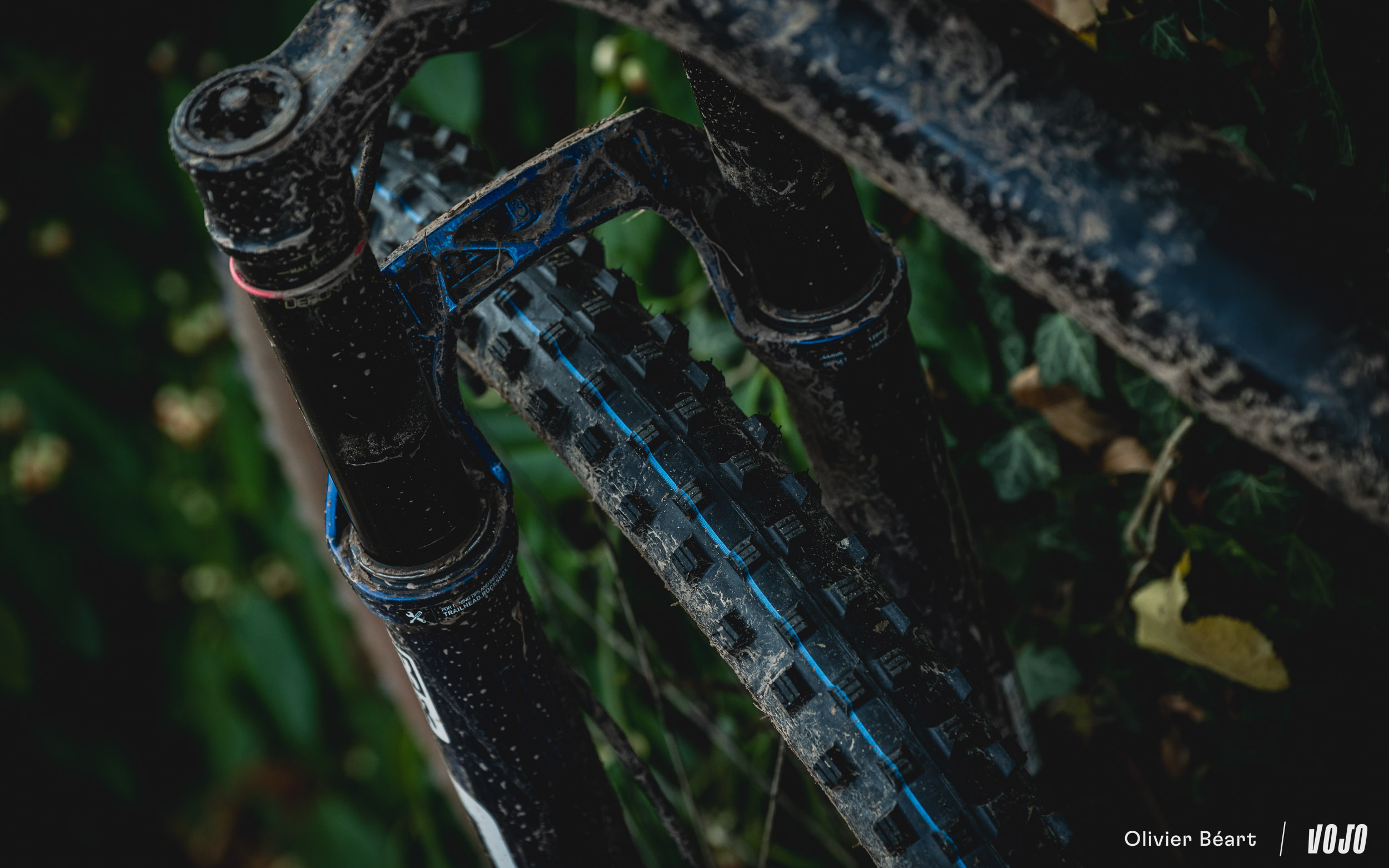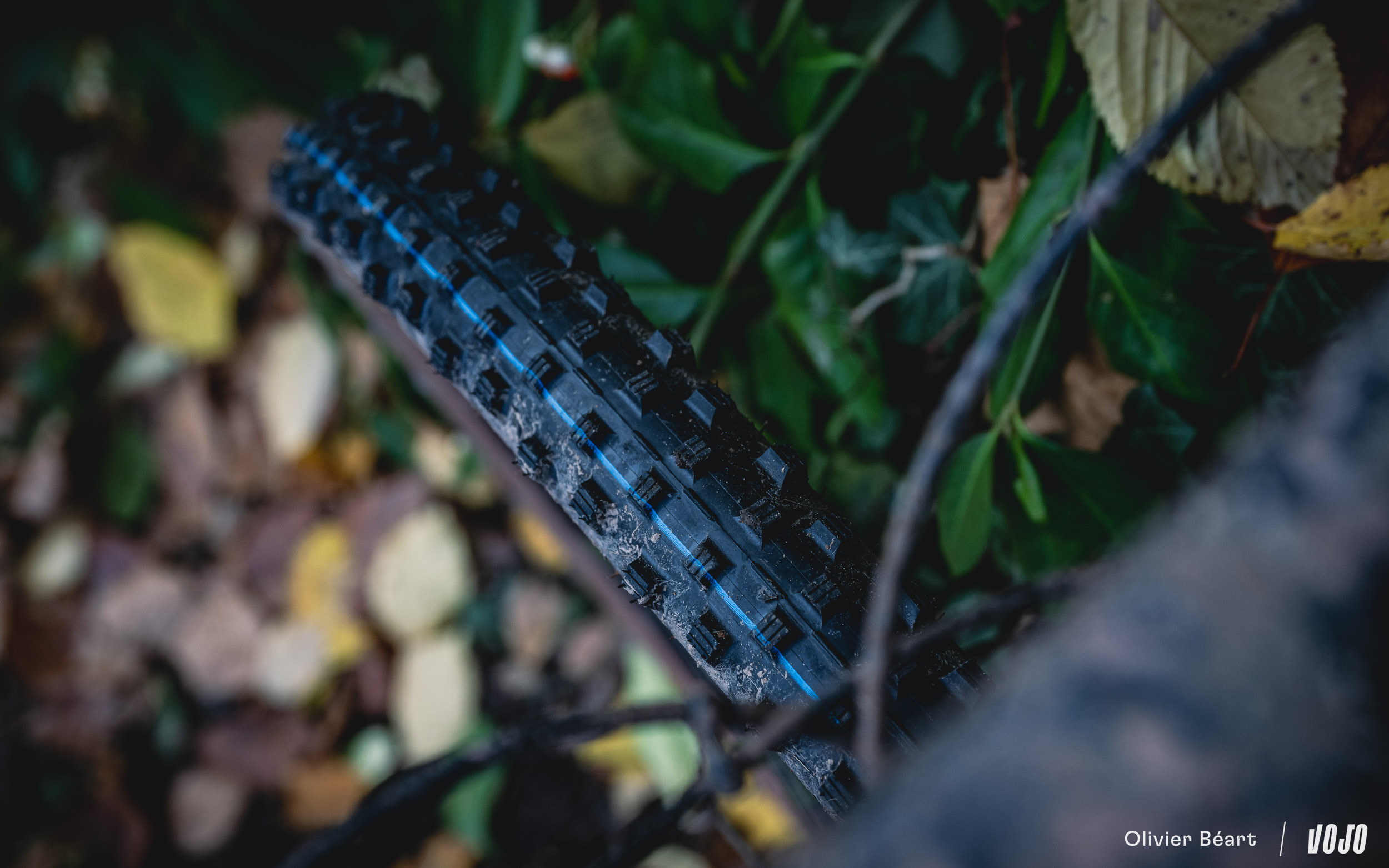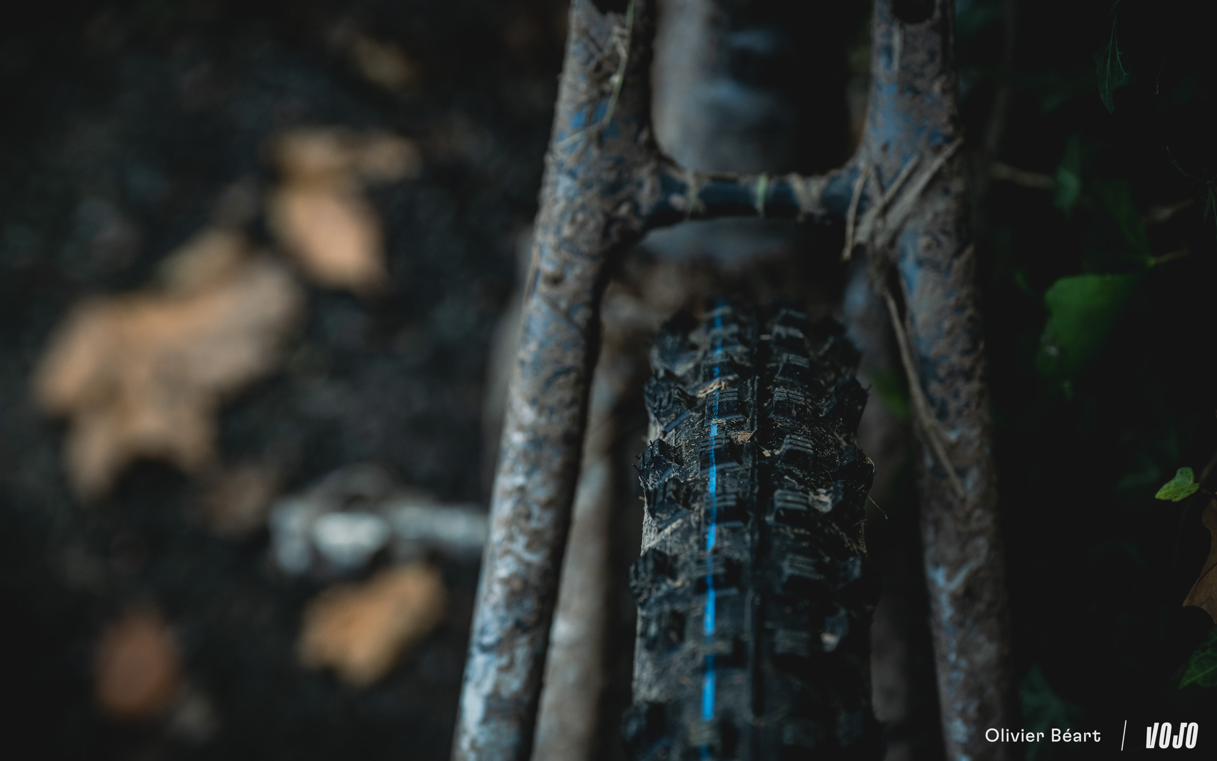 Avec lui, le ton est donné dès le début : il se destine bien à la boue grasse, collante et aux labourés ! Dans ces conditions spécifiques, il n’a pas vraiment d’égal et vous pouvez vous sortir de bourbiers improbables quand vos copains de ride font soit du sur-place en pédalant dans le vide ou bien poussent leur vélo aux pneus complètement bourrés de terre. Par contre, on s’y attendait, il impose de rouler avec des jantes plus étroites, de gonfler plus et sa faible section ne lui permet pas de se déformer beaucoup pour offrir du grip sur les sols durs ou les passages de racines/pierriers.