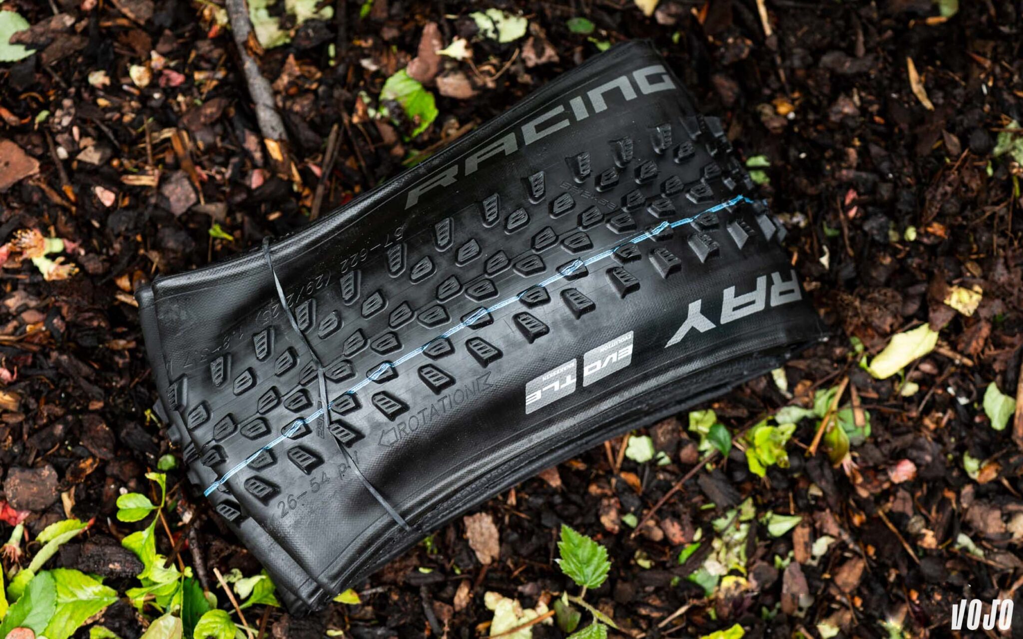 Tout d’abord, s’agissant de pneus « racing », ce duo offre peu de résistance au roulement et assure un très bon rendement sur les parties rapides. Le Racing Ray a un dessin optimisé pour le montage avant. L’orientation de ses crampons privilégie le grip latéral et il se montre excellent à ce niveau. Il permet d’assurer des trajectoires précises et il met en confiance avec un décrochage progressif. Gros point fort : sa polyvalence, car il est aussi bon sur le sec que dans les conditions humides. Pour ces dernières, on prendra juste soin d’opter pour la version à gomme Addix Speedgrip (bleue) plutôt que la version Addix Speed (rouge). D’autant que la version Speedgrip n’est, selon nous, pas vraiment pénalisante sur sol sec ou au niveau du rendement. Attention, à l’arrière, il n’offre pas une très bonne traction ni un bon rendement et il va avoir tendance à s’user vite. Un pneu à réserver au montage avant.