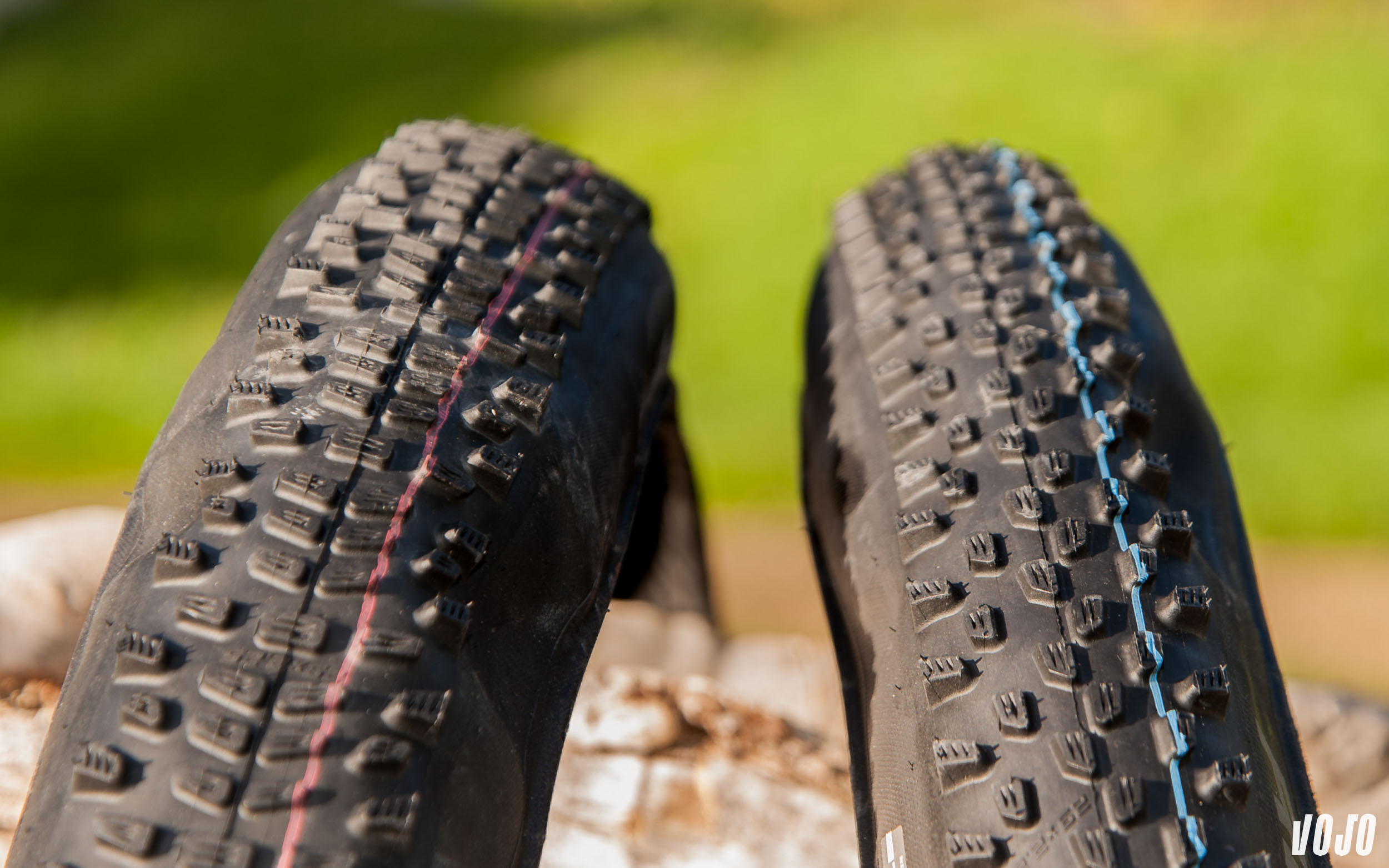 A propos de profil, un point qui peut être intéressant, et encore plus quand les conditions sont humides et l’adhérence difficile à trouver, c’est de différencier l’avant (à gauche) et l’arrière (à droite). Avec un profil optimisé pour la recherche de l’accroche latérale à l’avant, et de la traction/du passage de la puissance à l’arrière, on a plus de chance de parvenir à préserver un bon comportement à sa machine, même dans des conditions difficiles/humides. Nous verrons plus d’explications concrètes de ce point dans notre test des pneus Schwalbe Racing Ralph/Ray un peu plus bas.
