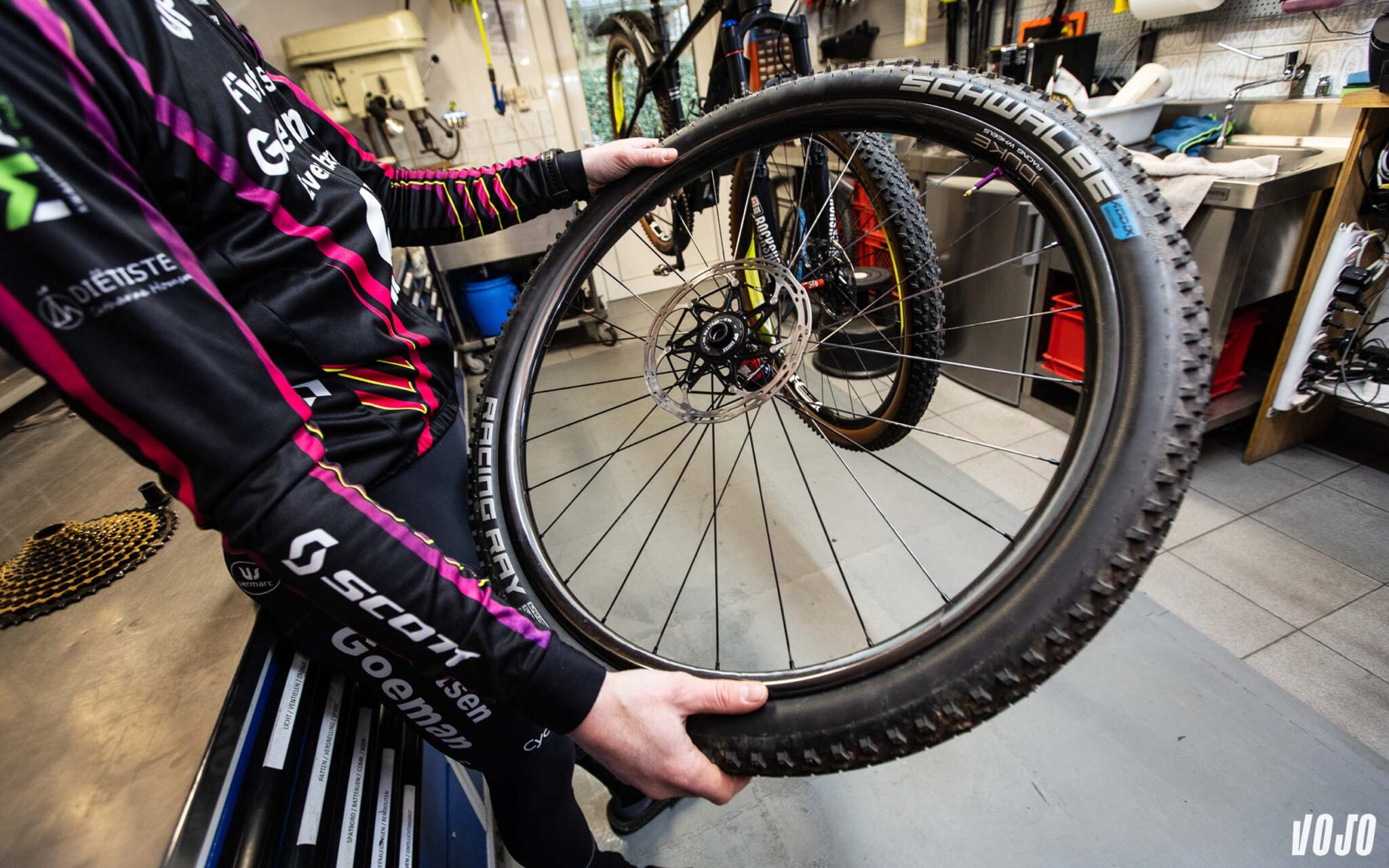 Toutes les marques n’offrent pas plusieurs choix de gomme pour un même profil comme le fait Schwalbe, mais quand on peut et même en cas d’usage de pneus à profil plus polyvalent, se tourner vers une gomme plus tendre, au moins à l’avant, va aussi permettre d’améliorer l’adhérence. Ce n’est pas tellement quand le sol sera mou (type boue collante) qu’on va y gagner, mais dès que le sol sera plus dur et sur les obstacles, vous sentirez immédiatement la différence au niveau confiance et accroche quand c’est humide. Par temps froid, une gomme plus tendre conservera aussi plus de flexibilité qu’une gomme déjà plus dure à la base. Bref, dans toutes les circonstances où l’adhérence du sol est précaire, pouvoir se reposer sur des gommes plus tendres, offrant intrinsèquement plus d’adhérence, sera d’autant plus important.