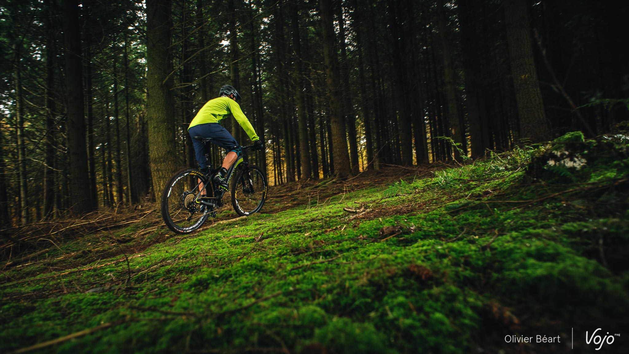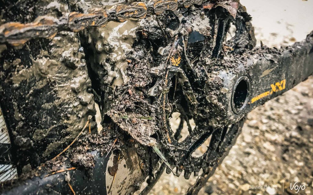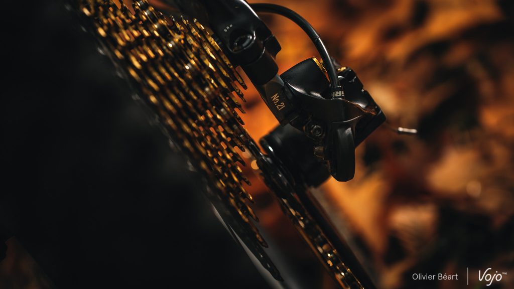 Quand tous ces paramètres sont réunis, on peut alors réellement profiter des grandes qualités du Sram XX1 Eagle, ainsi que de son silence de fonctionnement. Nous l’avions déjà noté lors de notre premier essai et cela se confirme : les bruits de transmission sont assez fortement réduits. C’est un détail, certes, mais on le remarque assez vite. La montée des rapports est souple et très précise, mais la descente est un poil plus brutale, peut-être à cause du ressort de tension de la chape encore plus fort que par le passé (Clutch Type 3). Par contre, le passage du 42 au 50 dents ne nécessite pas d’effort particulier et on sent qu’on a un groupe développé par des athlètes exigeants pour un usage au plus haut niveau.
