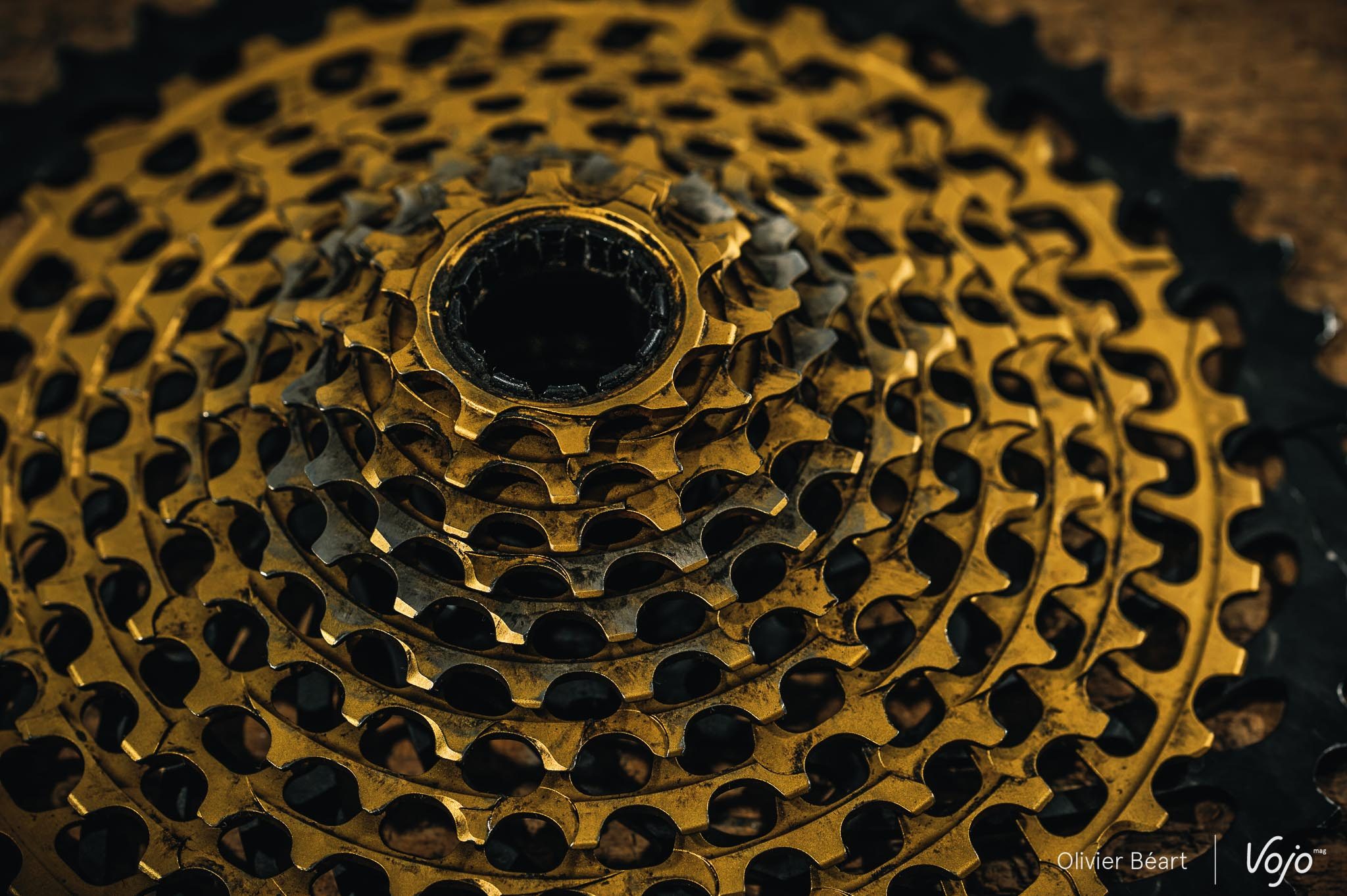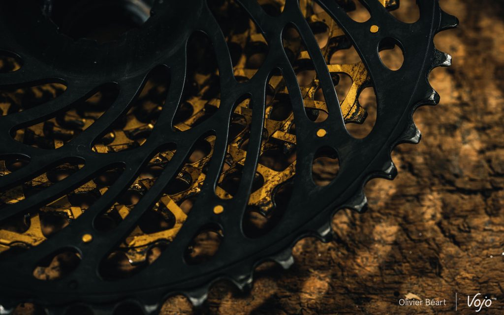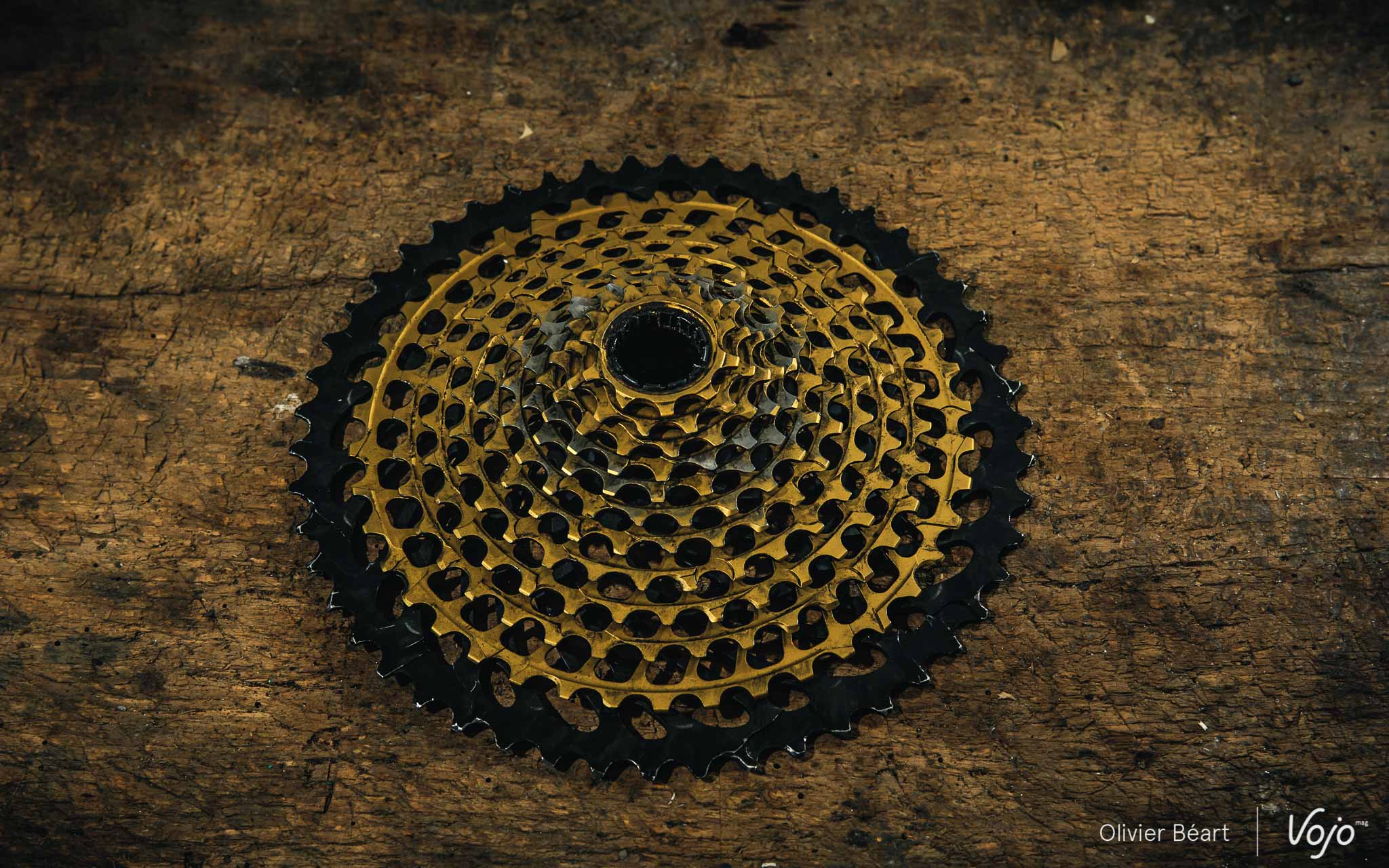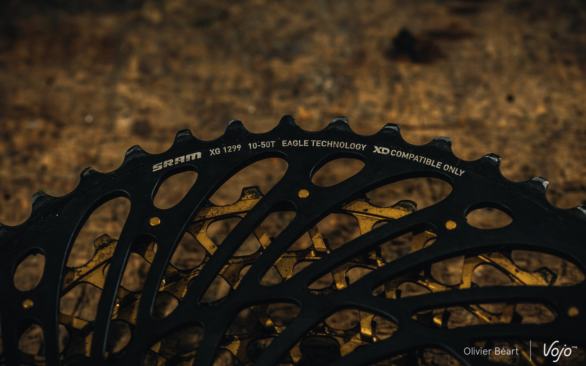 Lors de notre test longue durée du groupe Sram X1, et de nos très nombreux kilomètres avalés avec les cassettes 11 vitesses Sram, nous avons pu nous apercevoir de la très grande durabilité des cassettes de la marque. Néanmoins, sur le XX1 Eagle, nous nous sommes aperçus que le revêtement doré n’est pas inusable et l’acier nu est apparu sur les pignons les plus couramment utilisés après plusieurs sorties très boueuses. Cela dit, en dessous, le métal ne porte aucune marque d’usure et l’impact est avant tout esthétique. Mais à ce prix, cela fait tout de même un peu désordre.