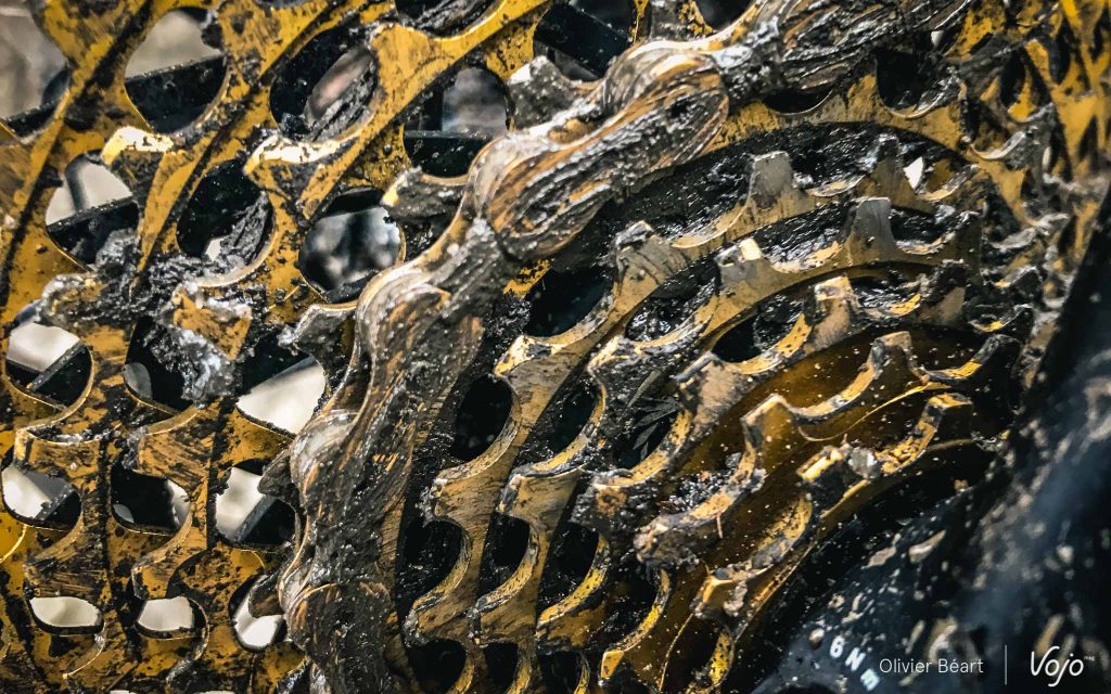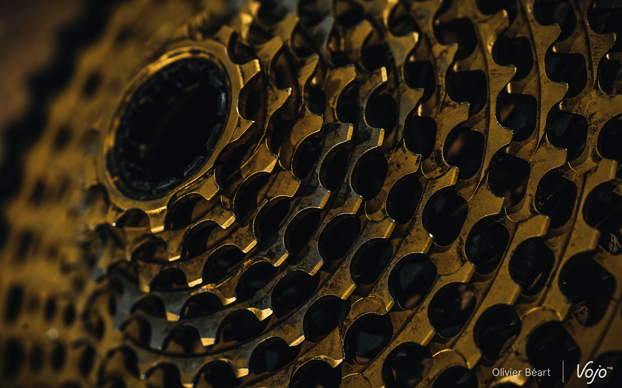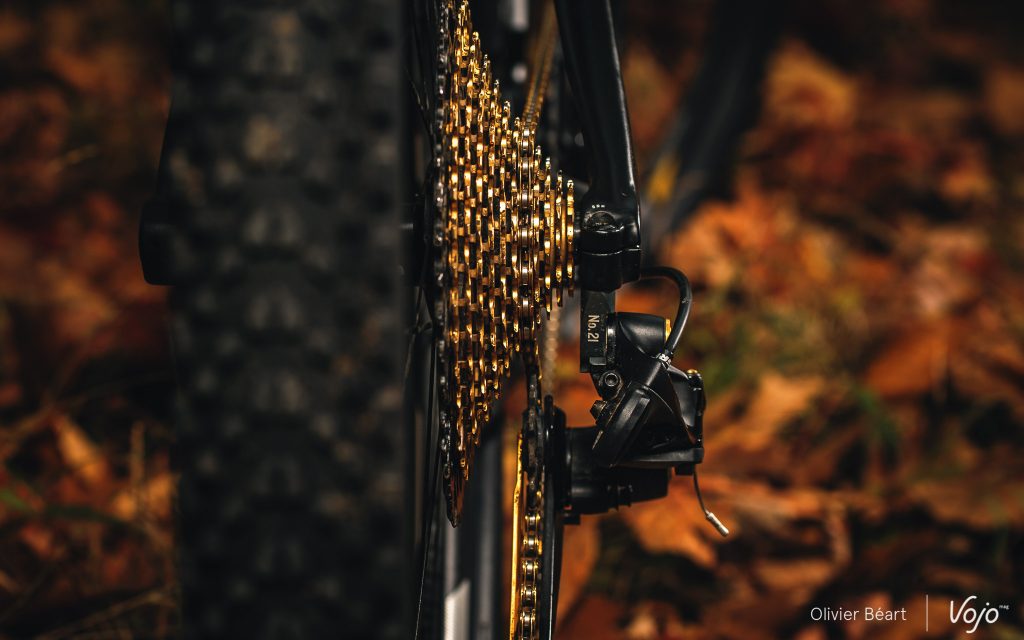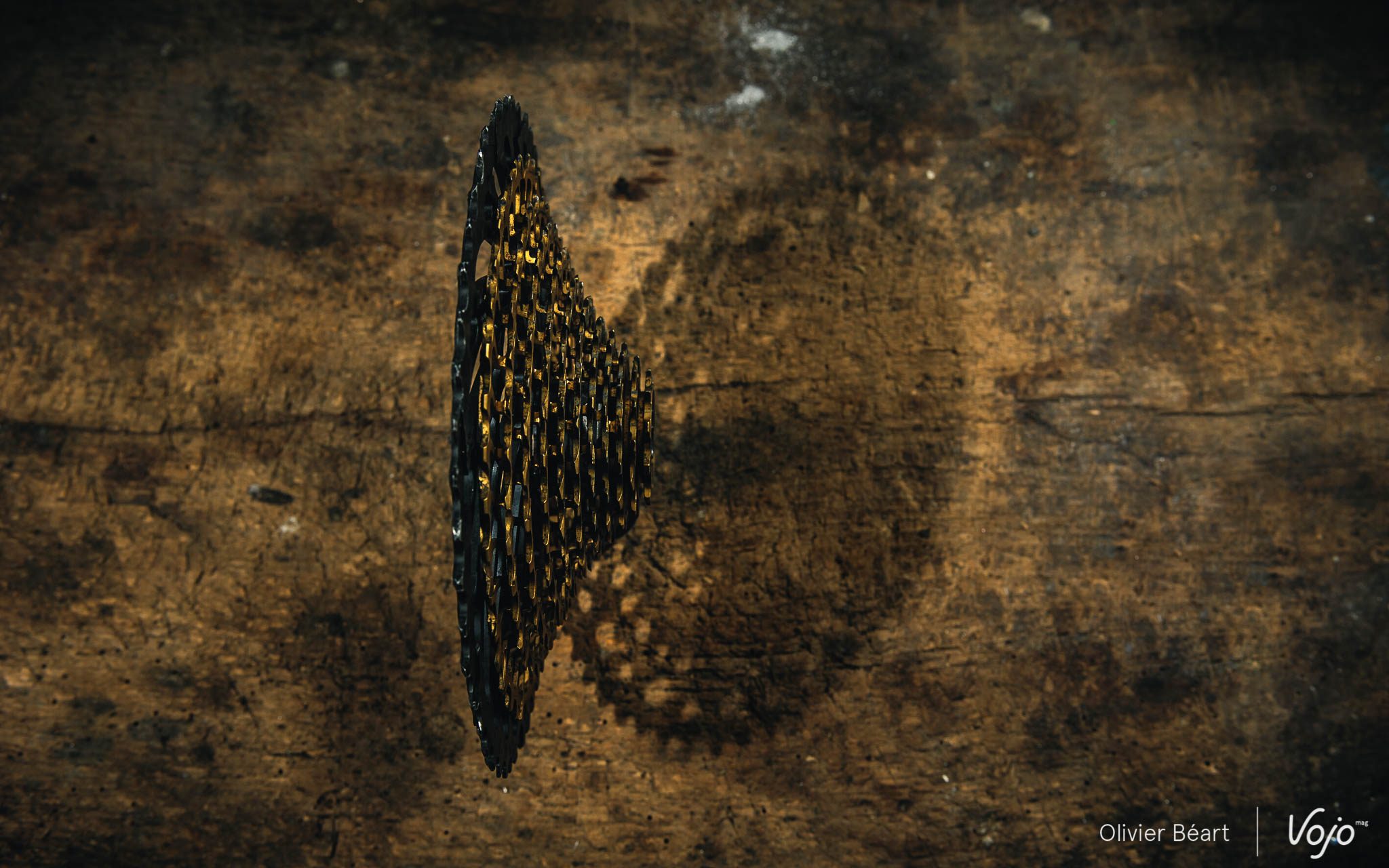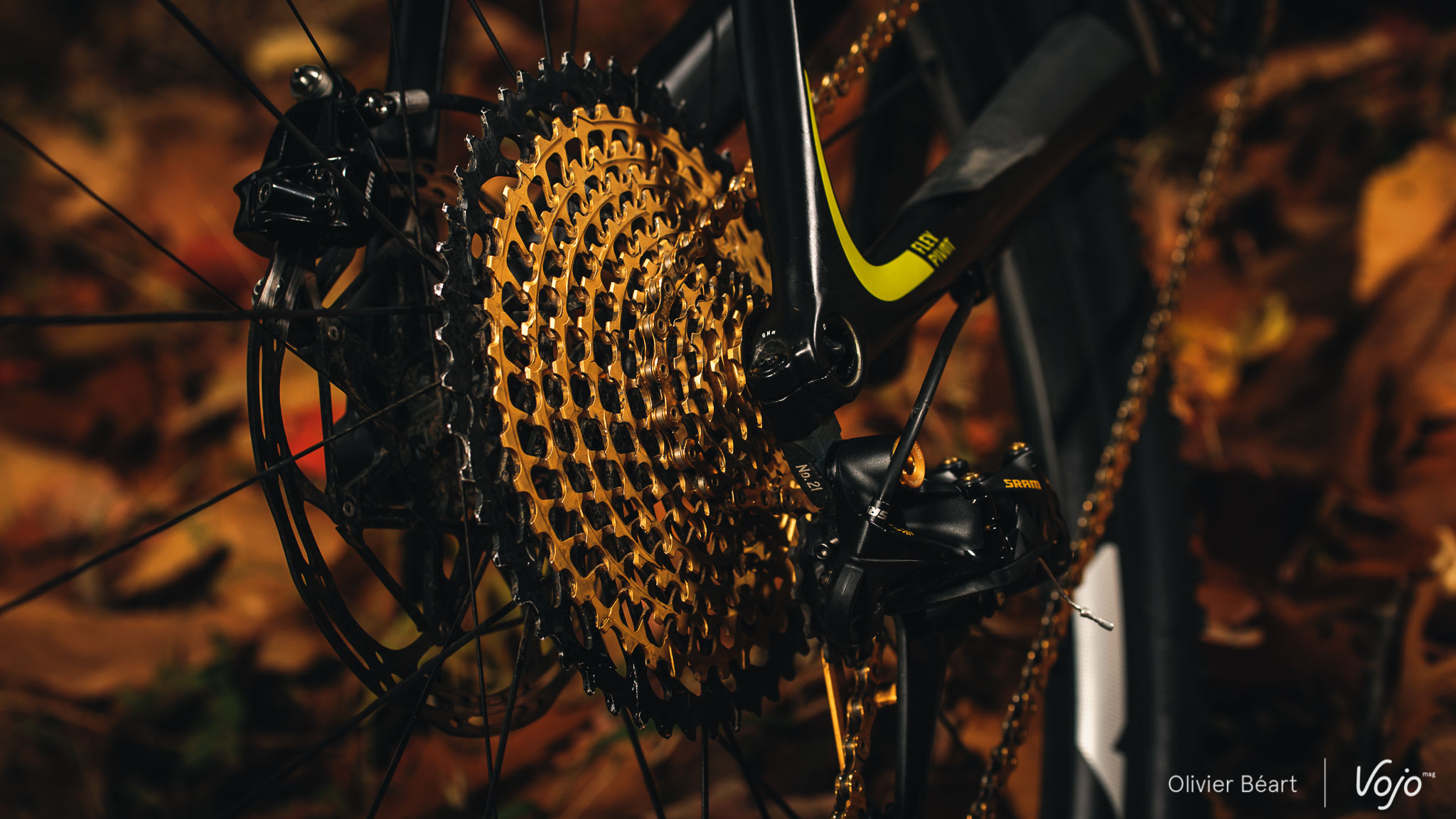 Lors de notre test longue durée du groupe Sram X1, et de nos très nombreux kilomètres avalés avec les cassettes 11 vitesses Sram, nous avons pu nous apercevoir de la très grande durabilité des cassettes de la marque. Néanmoins, sur le XX1 Eagle, nous nous sommes aperçus que le revêtement doré n’est pas inusable et l’acier nu est apparu sur les pignons les plus couramment utilisés après plusieurs sorties très boueuses. Cela dit, en dessous, le métal ne porte aucune marque d’usure et l’impact est avant tout esthétique. Mais à ce prix, cela fait tout de même un peu désordre.