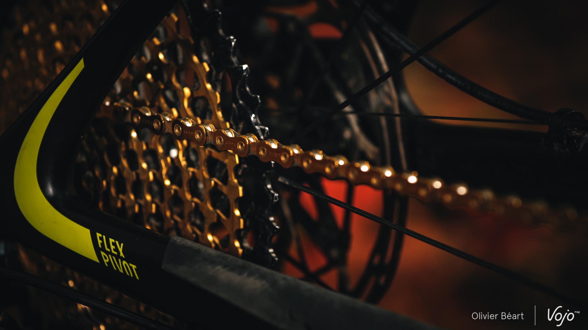 Comme expliqué plus haut, le passage aux 12 vitesses et la présence d’un grand pignon de 50 dents permet de voir plus grand au niveau de la taille du plateau. Notre Canyon Lux de test, en 29 », était équipé d’une couronne de 34 dents, ce qui s’est avéré être un choix particulièrement judicieux. On gagne en vitesse de pointe, sans perdre en capacité de venir à bout des pires côtes et sans fatiguer sur les longues distances.