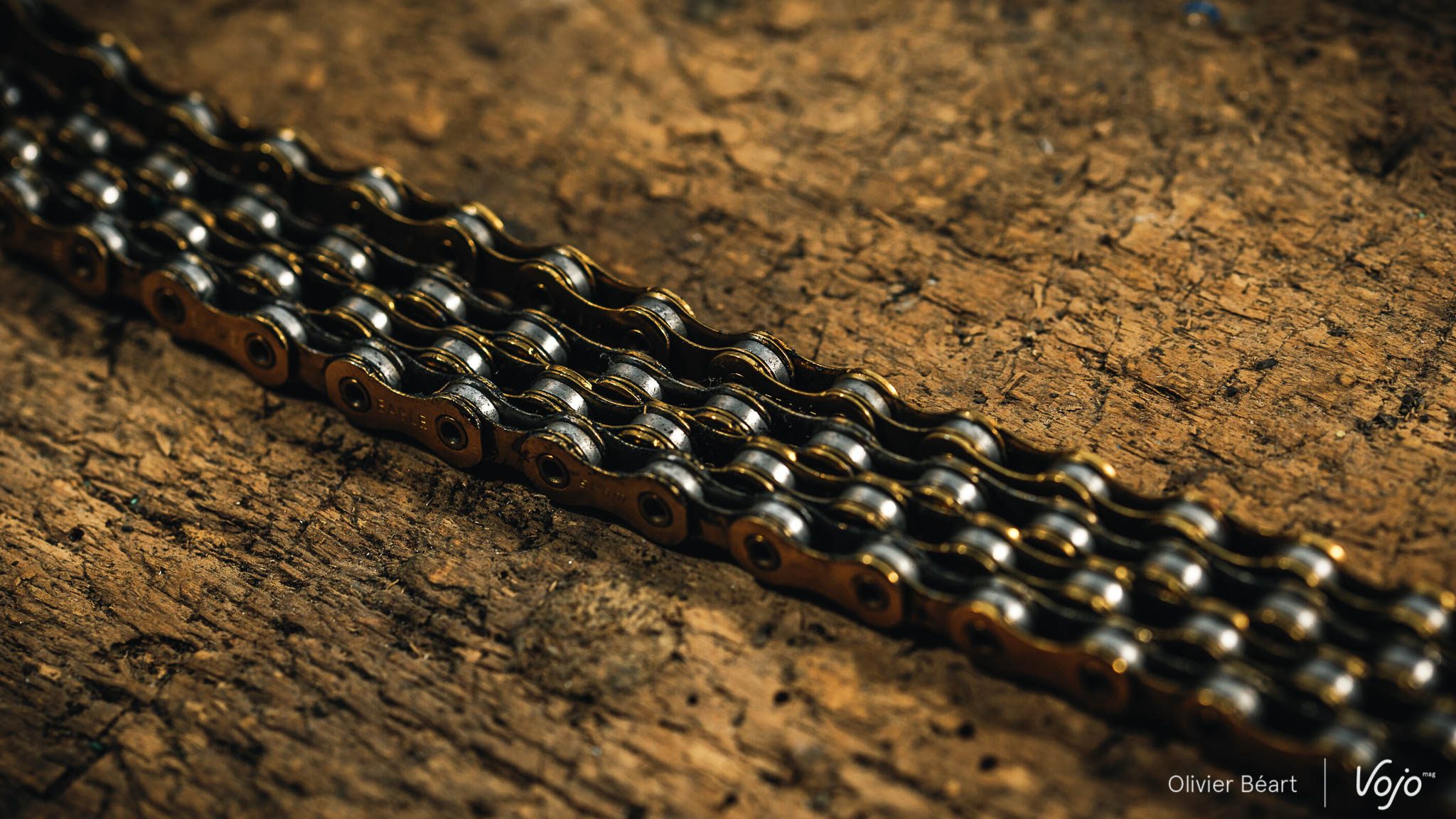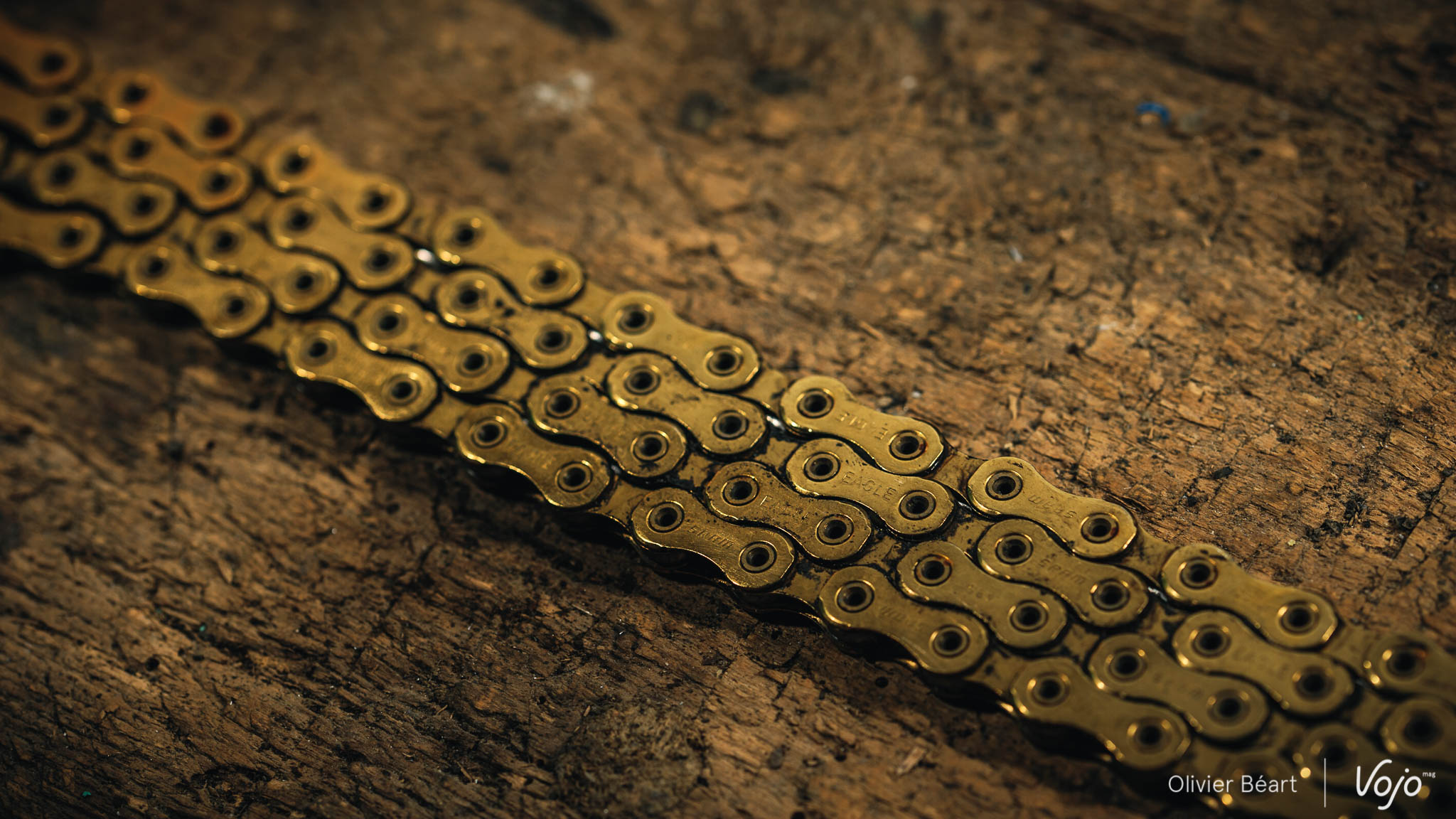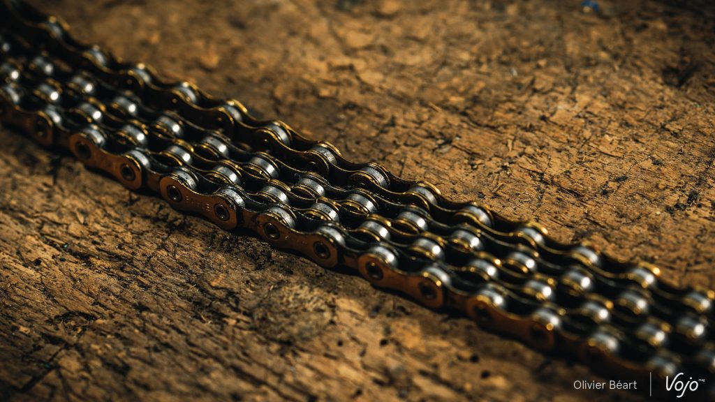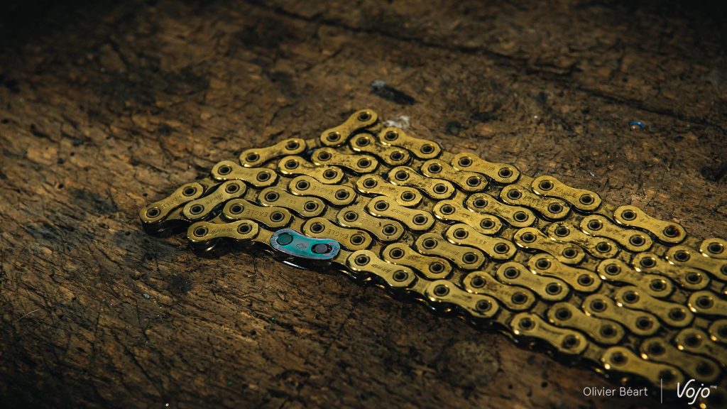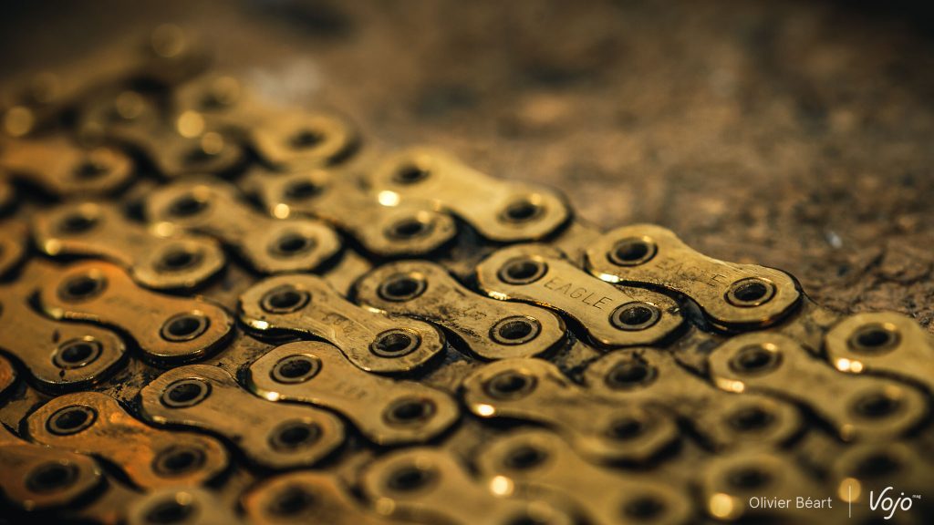 Même si c’est plus sa couleur qui saute aux yeux, la chaîne Sram XX1 Eagle a été modifiée en profondeur au niveau de son dessin. Son secret : elle n’a plus une seule arrête vive ! Sram annonce une réduction du bruit, des frictions et de l’usure tant de la chaîne elle-même ainsi que de la cassette et du plateau.
