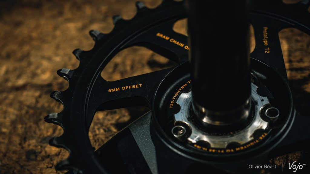 Le maintien assuré par les dents, dont le dessin a été revu (X-Sync 2), est absolument parfait et nous n’avons pas eu le moindre saut de chaîne ou chain-suck à déplorer, même dans la grosse boue. La ligne de chaîne est également parfaite et le rétro-pédalage n’entraîne pas de chute de plusieurs pignons, même quand on est sur le 50 dents derrière. Enfin, côté usure, la finition noire est partie assez rapidement, mais les dents ne semblent pas marquées excessivement. On peut s’attendre à une résistance à l’usure dans la moyenne, comme sur les plateaux de la précédente génération.